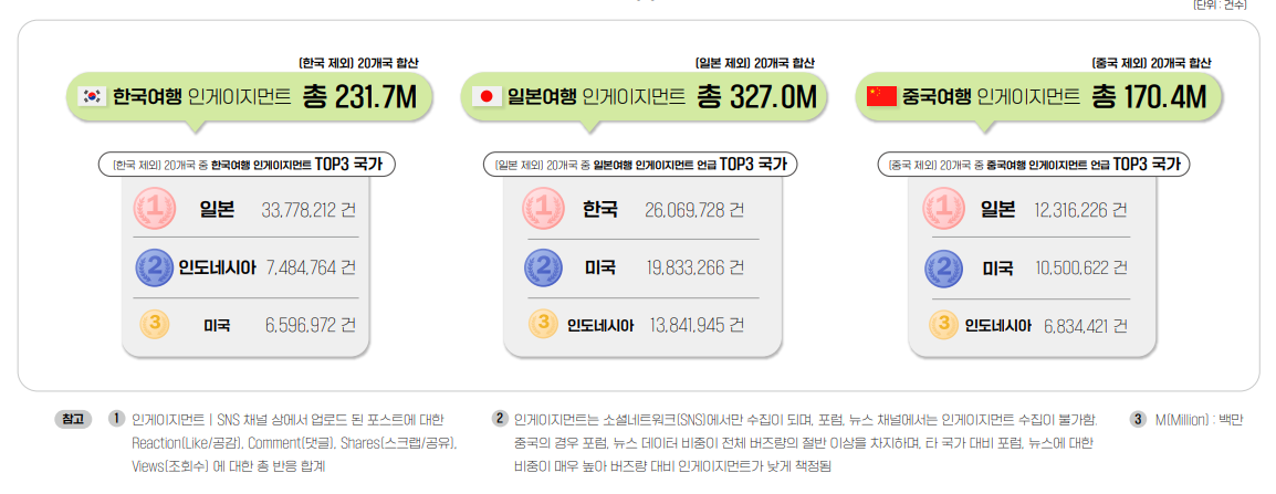 한중일 등 여행자들의 인게이지먼트(Engagement) 통계가 있다. 한중일 등 여행자들의 인게이지먼트란 SNS 채널 상에서 업로드된 포스트에 대한 리액션(반응, 공감, 댓글, 공유 등)에 대한 합계다.