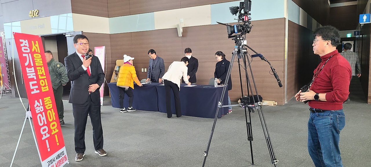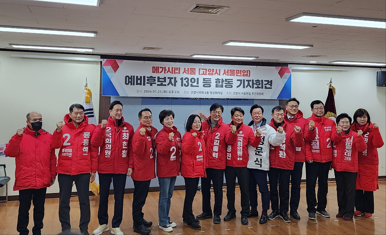 2024.01.23. 국민의힘 국회의원 예후보 전원이 서울편입 추진 합동기자회견 추진위원회는 고양시 국회의원 예비후보들에게 고양시 서울편입 공약(공개약속)을 요청했고, 이에 야당은 반응이 없었고 국민의힘 예비후보 14명은 모두 합동기자회견을 통하여 서울편입 추진을 공개선언했다.