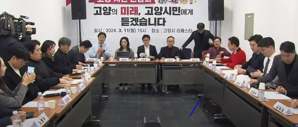 2024.03.11. ‘경기-서울 리노베이션’ 고양시민 간담회 모습. 사진 = MBS뉴스 캡처출처한동훈 국민의힘 비상대책위원장이 3월 11일 경기분도-서울편입 리노베이션 TF전원을 대동하고 일산 라페스타 빈사무실에서 필자와 강경철 위원장 그리고 국힘 고양시 후보 전원과 약 1시간 반동안 간담회를 가졌다.