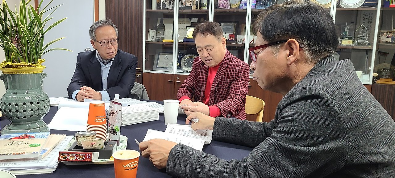 2023년 12월 12일 바이네르 김원길 회장 사무실에서 김영석 박사(추진위 공동위워장)와 서울편입 추진 논의