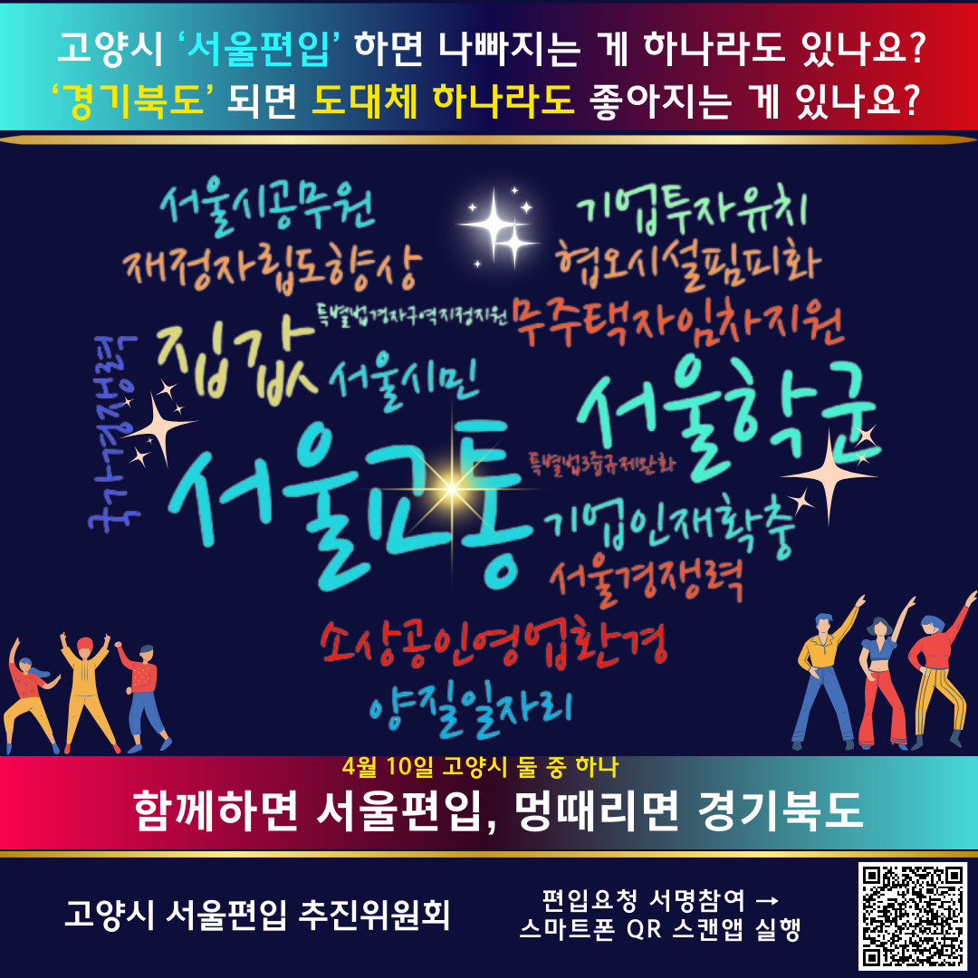 2023년 11월부터 이균철, 이홍규, 고부미 공동위원장 등이 서울편입에 대하여 적극적인 가두 서명운동을 전개하였다. 또 고양 갑 권순영 고문(당협위원장), 김종혁 고문(고양병 당협위원장)등이 서울편입 구글설문조사, 현수막 게첨 등 서울편입 홍보활동을 주도하였다.