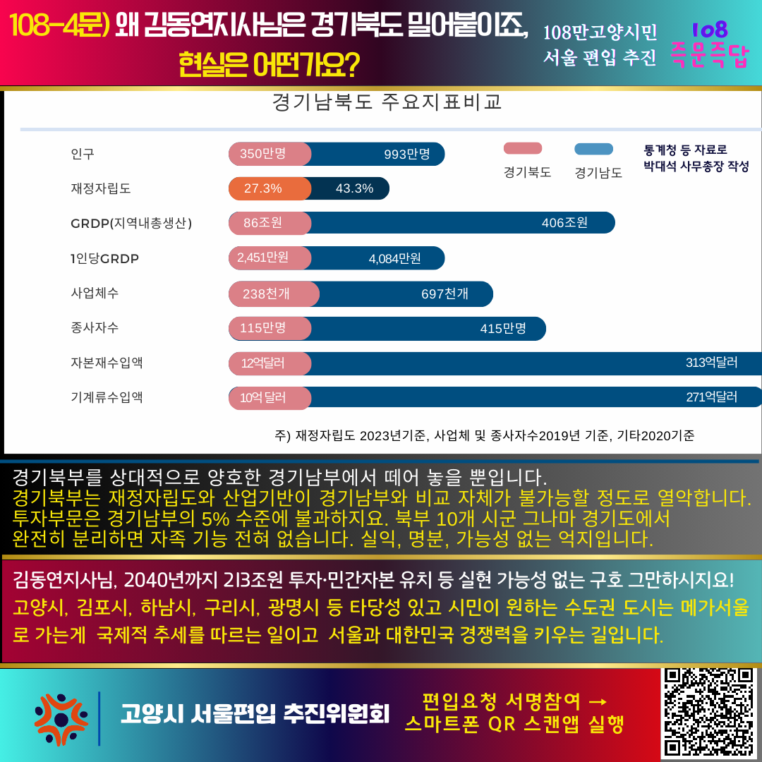 이동환 시장의 속내는 자신의 시장자리가 없어지는 것이 싫은 것으로 보인다. 이에 동조하는 자들이 일부 있는데 마찬가지로 고양시에서 차기 시장자리를 노리는 일부 인사들이다. 고양시와 서울 그리고 대한민국이 아니라 개인 사심으로 이러한 중차대한 문제를 대하는 자세가 한심스럽고 통탄할 일이다.