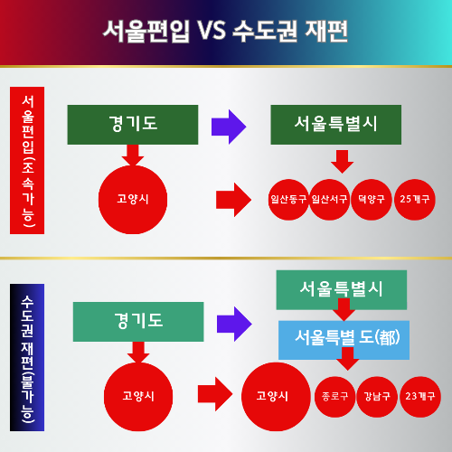 필자 작성수도권재편은 전제조건이 서울을 서울특별도로 바뀌어야 한다. 수도의 성격을 바꾸는 일이다. 그리고 난 후 고양자치시의 예산권, 행정권 등을 그대로 유지한 채 서울특별도에 소속하게 한다는 발상이다. 되기도 어렵지만 되어도 시민입장에서는 당장 좋아질 것이 하나 없는 기득권자의 행정편의적 구시대 발상 그 자체다.