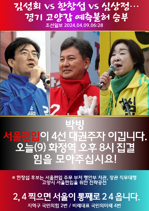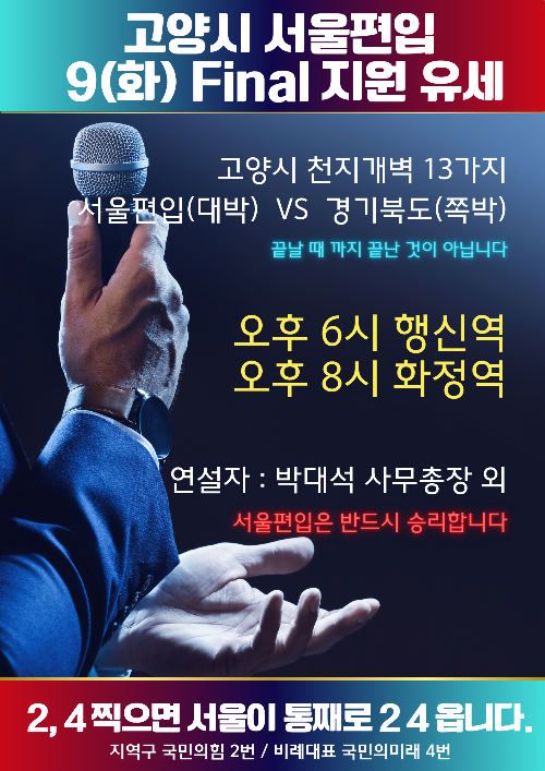 이제 고양시 서울편입 등 메가시티 서울이 순조롭게 추진되려면 국민의힘이 과반의석을 차지하고 고양시에서 최소 2명 이상은 당선되어야 한다. 부족하지만 고양시 각 지역에 서울편입 등 주제로 지원유세로 목이 쉬었다. 오늘 마지막으로 화정역과 행신역에서 사자후를 토해내려 한다.