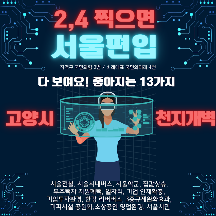 보여주기(쇼잉) 위하여 막대한 예산, 장시간이 필요한 부질없는 장기고문에 가까운 공약은 이제 중지해야 한다. 우선 고양시의 컬러(정체성과 나아갈 방향)를 정해야 한다. 필자가 생각하기에 고양시는 '한강 문·예·체 산업도시'가 맞다.