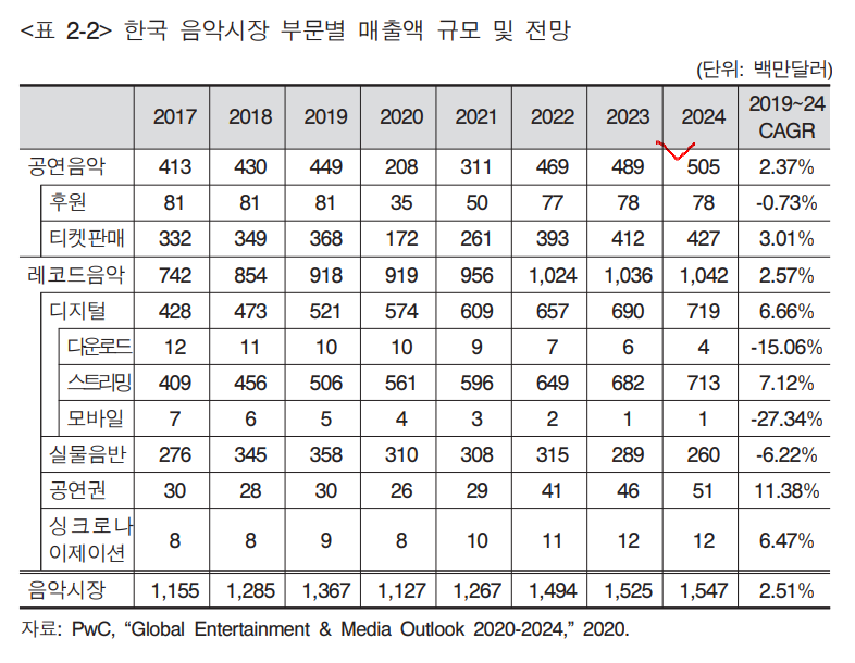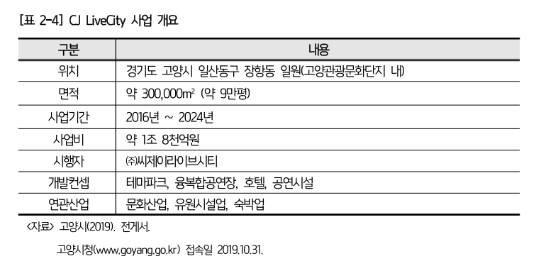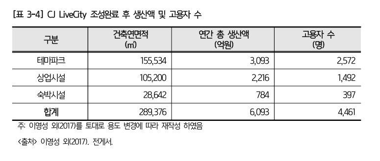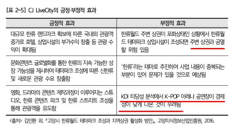 또 한국의 공연음악시장은 그리 크지 않다. KDI가 202년 1월 펴낸 'K-POP공연산업의 발전방안 연구'에 따르면 2024년 기준 한국의 공연음악시장은 505백만 달러, 한화로 약 6,500억 원에 불과하다. 이에 따라 CJ라이브시티조성 전과 후에 경제적 파급효과도 사실상 재검토가 필요하다.