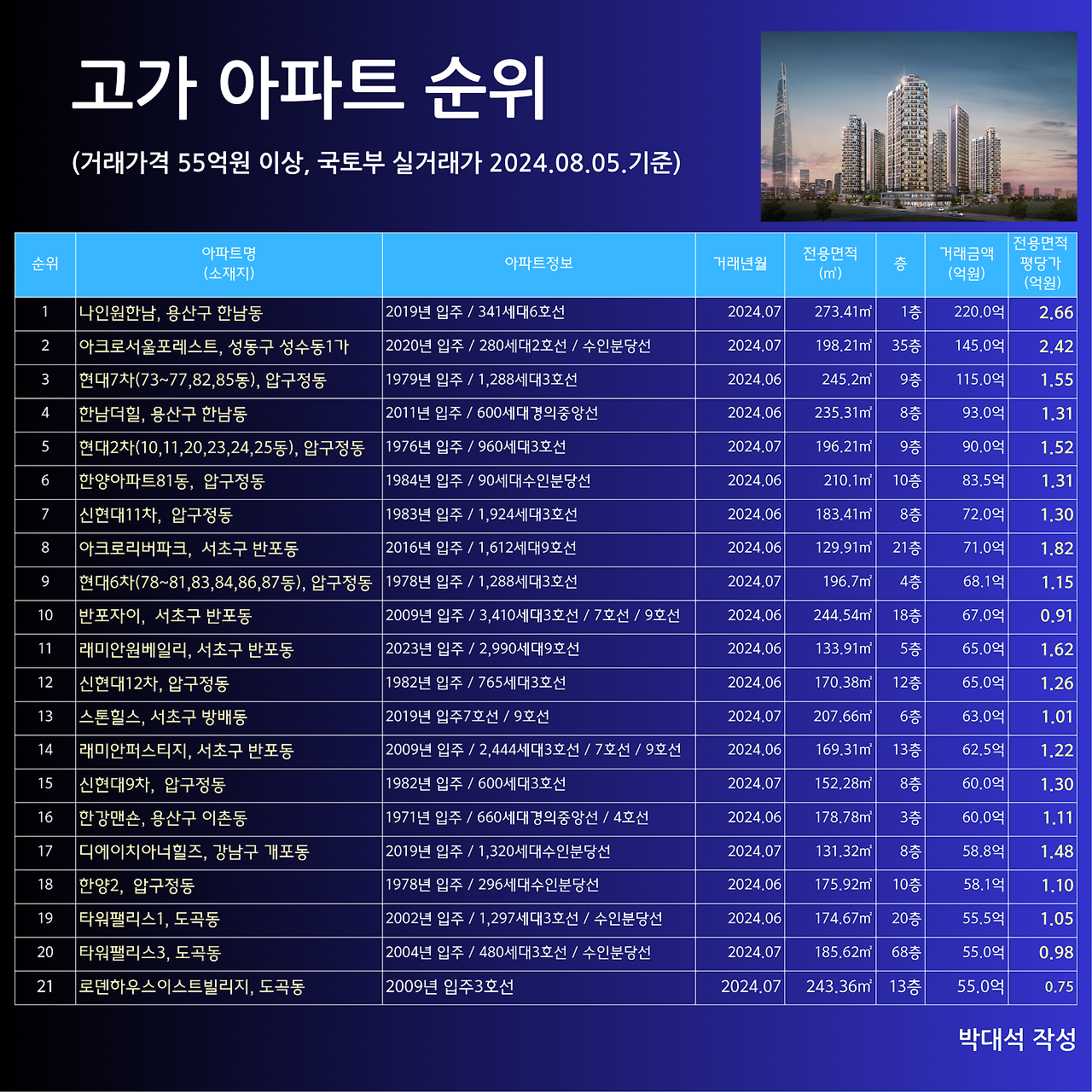 8월 5일 국토부 실거래가 기준으로 1위는 용산구의 나인원한남 전용면적 273.41㎡(82.6평)으로 220억 원에 거래되었는데 전용면적 평당 2.7억 원을 넘어섰다. 2위는 성수동의 아크로서울포레스트 전용면적 198.21㎡(59.9평)이 145억 원(평당 2.4억 원), 3위는 강남구 압구정동의 현대 7차 전용면적 245.2㎡(74.1평)이 115억 원(평당 1.6억 원)이다. 계속 신고가를 찍고 있는 추세다.
