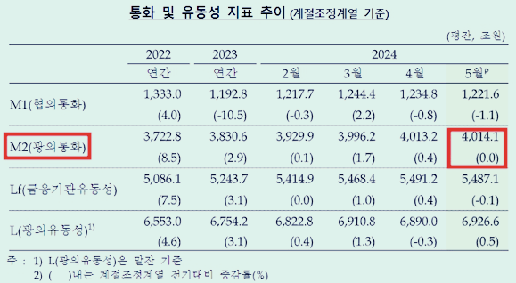 한국은행 7월 15일 「2024년 5월 통화 및 유동성」 보도자료 1쪽