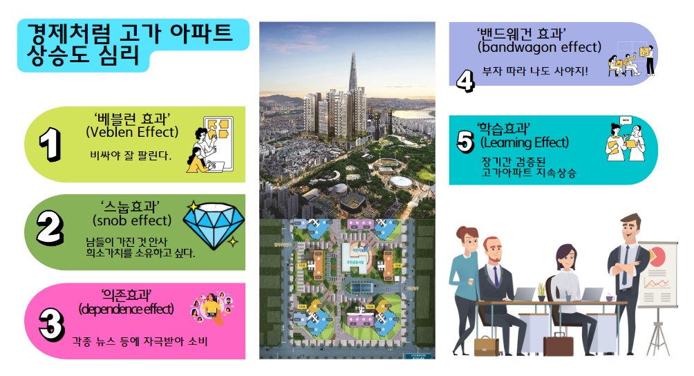 자본주의의 사회에서 부자들이 희소성 있는 고가아파트에 거주함으로써 얻는 차별적인 만족감은 기본이다. 늘 사줄 매수자(Buying power)가 있어 고가 아파트 매물이 나오자마자 사라지니 꾸준히 가격이 상승한다.