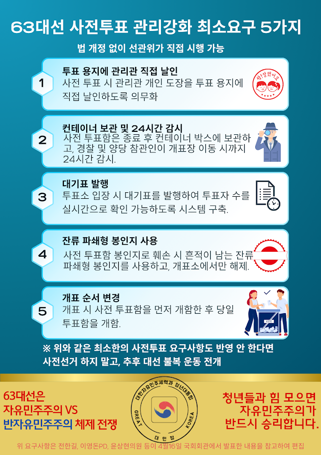 부정선거 온상인 사전선거도 법개정 없이 선관위가 수용할 수 있는 투표관리관 날인 등 최소한의 5가지 사항을 관철시키면 된다.