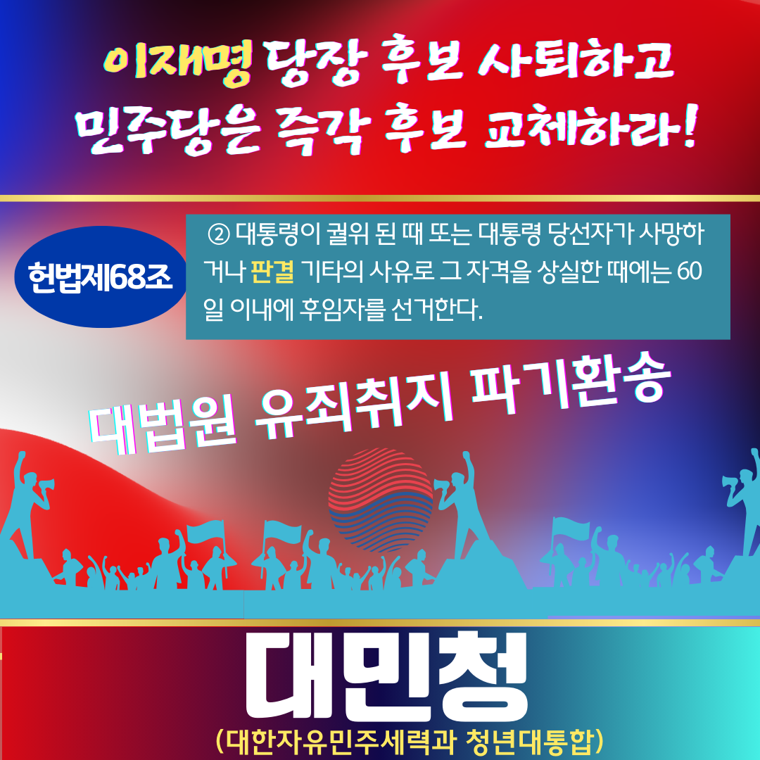 따라서 이재명 후보는 즉각 사퇴하고 민주당은 당장 후보를 교체해야 타당합니다. 그렇지 않으면 민주당은 완전히 폭망 하고, 1987년 호헌철폐 이상으로 이재명 사퇴를 요구하며 국민대다수가 총궐기합니다. 한국의 국내외 손실 역시 막대해집니다.