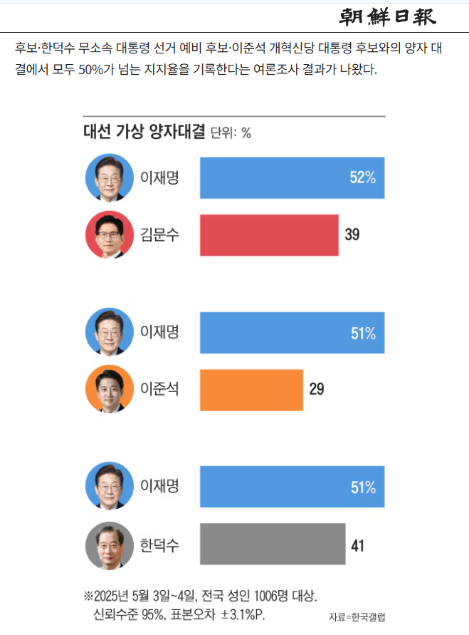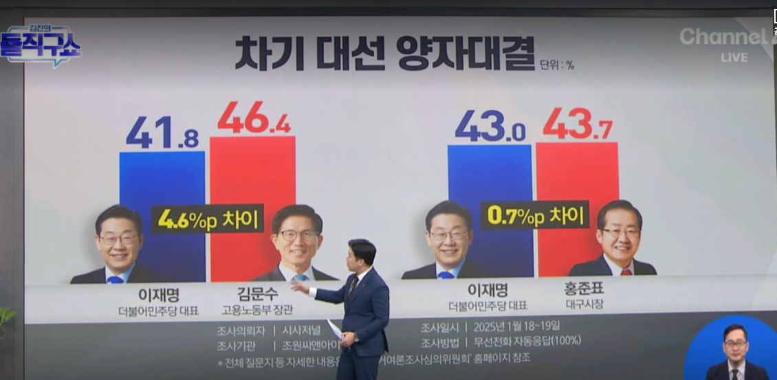결론적으로, 현재 무법무도한 대명사처럼 불리는 이재명 후보가 누리고 있는 높은 지지율은 수많은 의혹과 논란, 그리고 외부 요인에 의해 부풀려진 측면이 강하다. 반면 김문수 후보는 경선 과정에서 보여준 저력과 정정당당함, 그리고 변화하는 유권자 지형 속에서 강력한 경쟁력을 확보하고 있다. 지난 1월 18일 이재명과 김문수 양자대결에서는 4.6% p를 김후보가 앞섰다. 머지않아 골든크로스를 거쳐 김후보가 역전하리라 예상된다.