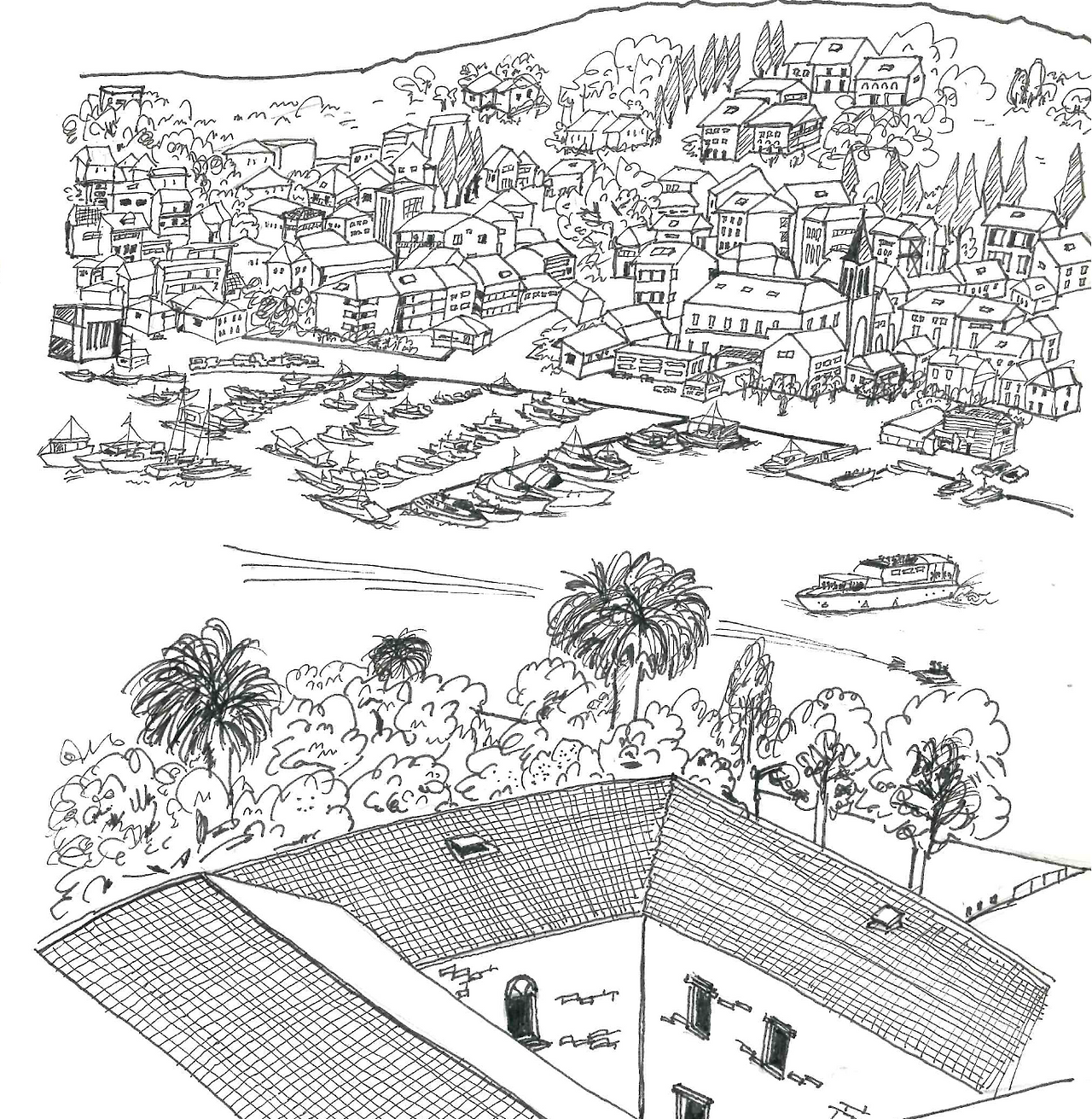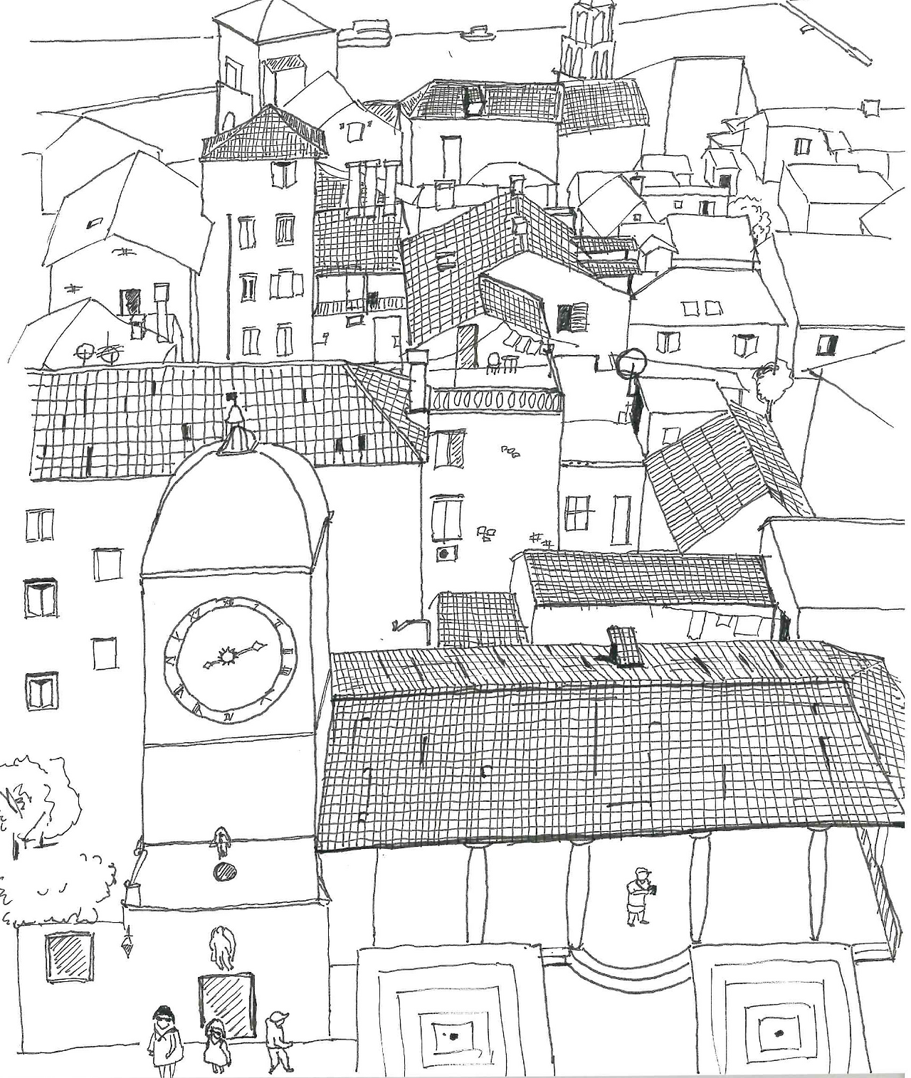 여행 후에, 성 로브로 대성당에서 보이는 동네 전망을 실사와 심상의 스케치로 비교해보니, 당시 내가 느낀 묘한 감동이 사진보다 어설픈 스케치에서 더 느껴졌다.