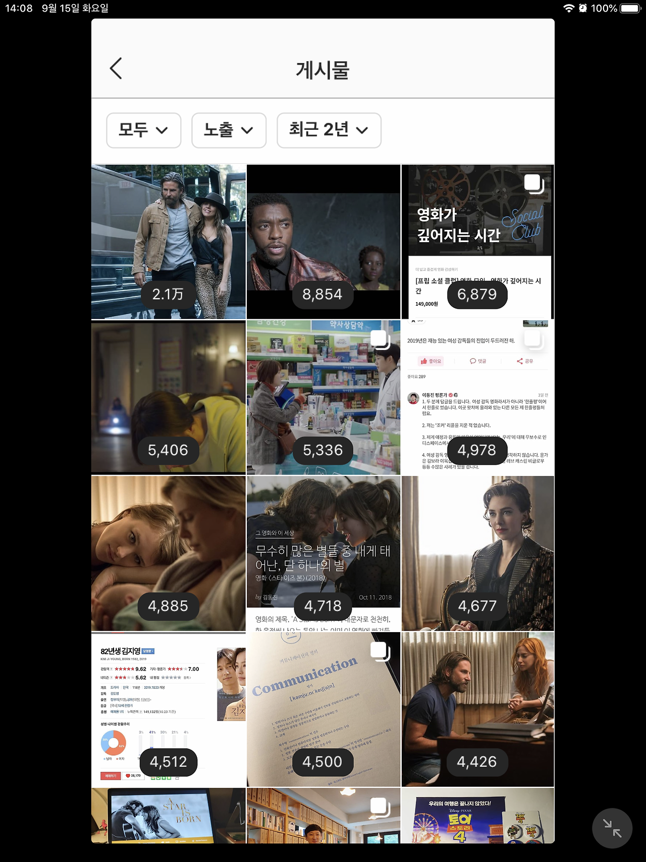 결국 시간이 지나고 돌아보면 언제나 '올리고 싶은 것을 올리고 싶은 시간에 올리고 싶은 방식으로' 쓴 게시물들이 오래 남았다. 도달 인원이 몇 명이고 좋아요 수가 몇 개이고 그중 몇 명이 글을 읽었는지 그런 것보다도 언제나 그게 더 중요한 것 같다. 사진 속 <스타 이즈 본> 관련 피드 도달율을 보면 'cosmos__j 님을 팔로우하지 않는 사람의 비중이 92%입니다'라고 나온다. 대충 가져온 영화 스틸컷에, 평소 내가 쓰는 글보다야 훨씬 짧지만 그래도 한 문단은 되는 글이었다. 극장에서 두 번째로 보고 나서 남겼던 후기. 누군가의 것이나 누군가를 위한 것보다 언제나 내 것을 쓰는 게 더 중요해진다.