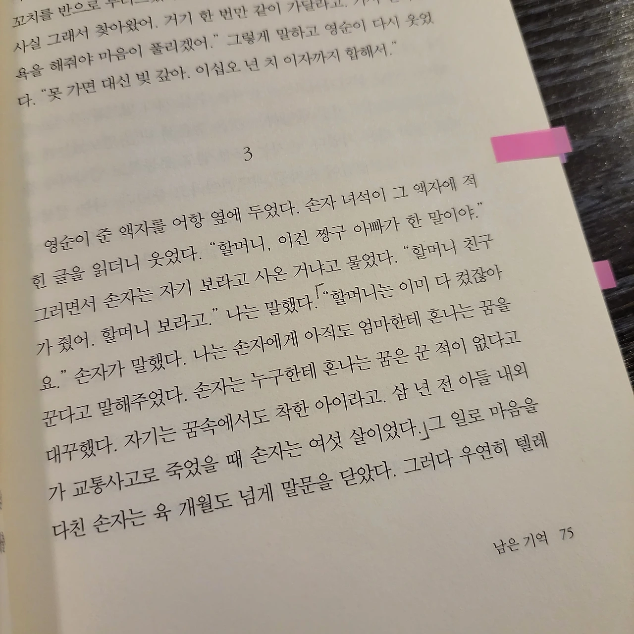 “할머니는 이미 다 컸잖아요.” 손자가 말했다. 나는 손자에게 아직도 엄마한테 혼나는 꿈을 꾼다고 말해주었다. 손자는 누구에게 혼나는 꿈은 꾼 적이 없다고 대꾸했다. 자기는 꿈속에서도 착한 아이라고. 삼 년 전 아들 내외가 교통사고로 죽었을 때 손자는 여섯 살이었다.
