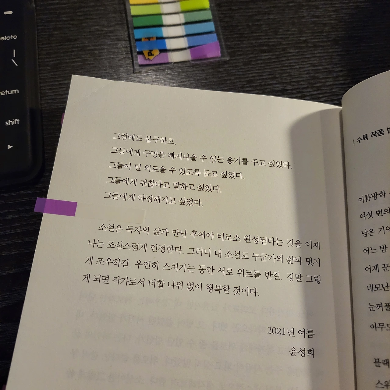 마침 소설집의 첫 단편 제목이 「여름방학」이어서, 두 해 전 여름에 읽은 시집 속 한 부분을 떠올린다. "가고 있다는 사실만으로도 어떤 시간은 반으로 접힌다/ 펼쳐보면 다른 풍경이 되어 있다" (안희연, 「여름 언덕에서 배운 것」, 『여름 언덕에서 배운 것』(창비, 2020))
