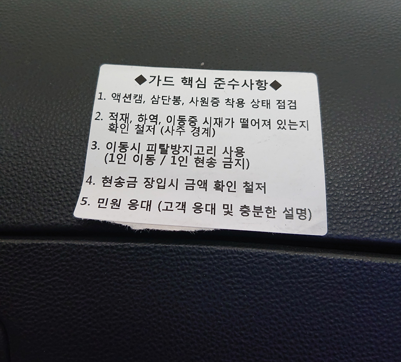 - 주말에 진행되는 현금 호송 아르바이트도 해봤다. 전국 각지의 은행, 편의점, ATM 등에 현금 수송을 담당하는 업체들이 있는데, 거기에 임시적으로 자리가 필요하거나 하여 일용직으로 가서 일하는 것이었다. 메신저, 드라이브, 가드로 구성된 한 팀이 차를 타고 각 위치별로 이동해서 그곳에 필요한 만큼의 오만 원권/만 원권을 채워 넣는 역할을 한다. 대개 단기 구인의 대상이 되는 '가드'는 (따라다니면서 말 그대로 '가드'의 역할을 한다) 평이한 업무였지만 내가 일했던 곳에서 담당하는 지역 중에는 마사회 지사도 있었다. 수천만 원의 '돈다발'이 오가는 걸 보면서 막연하게나마 자본에 대해 생각하게 되었던... 것은 아니고 대기시간에는 할 게 없어서 전자책을 보거나 하며 시간을 보냈다.