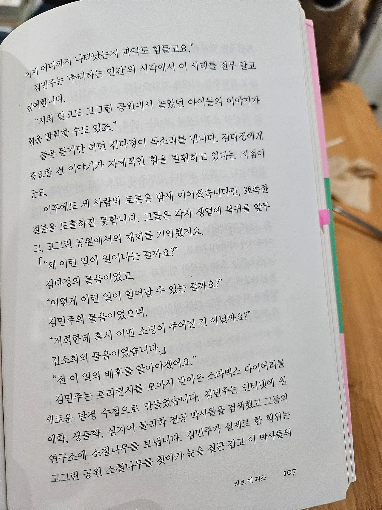 “왜 이런 일이 일어나는 걸까요?”라고 묻는 김다정과 “어떻게 이런 일이 일어날 수 있는 걸까요?”라고 묻는 김민주와 “저희한테 혹시 어떤 소명이 주어진 건 아닐까요?”라고 묻는 김소희가 한데 모여 토론과 회의를 거듭하다가도, 「러브 앤 피스」 속 인물들은 저마다의 시각에서 해결 대신 모험을 한다. "나무의 입장이 아니라, 이 세계 전체의 견지에서 흘러가야 할 방향 같은 게 있는 거 아닐까요?" (106쪽)