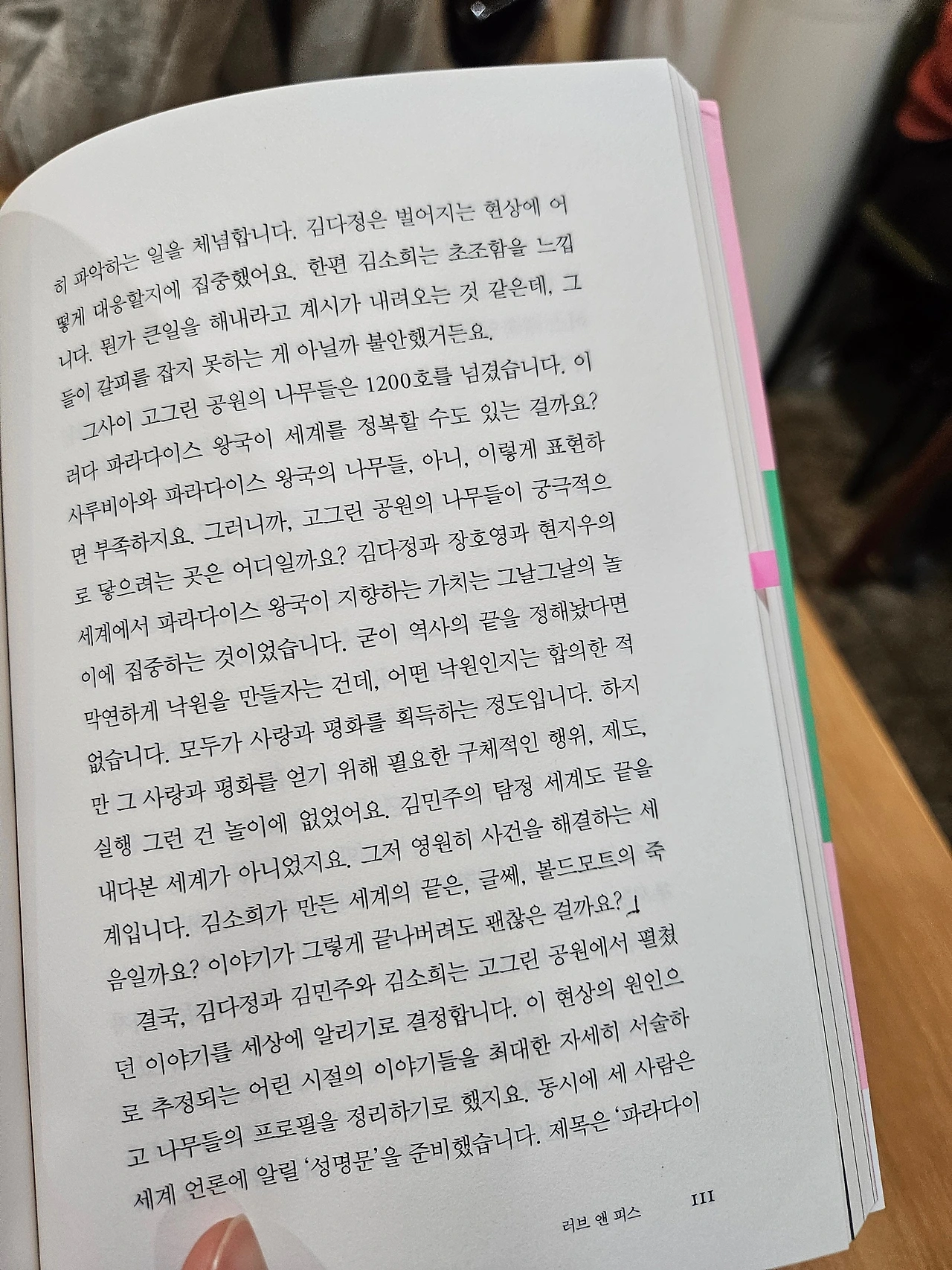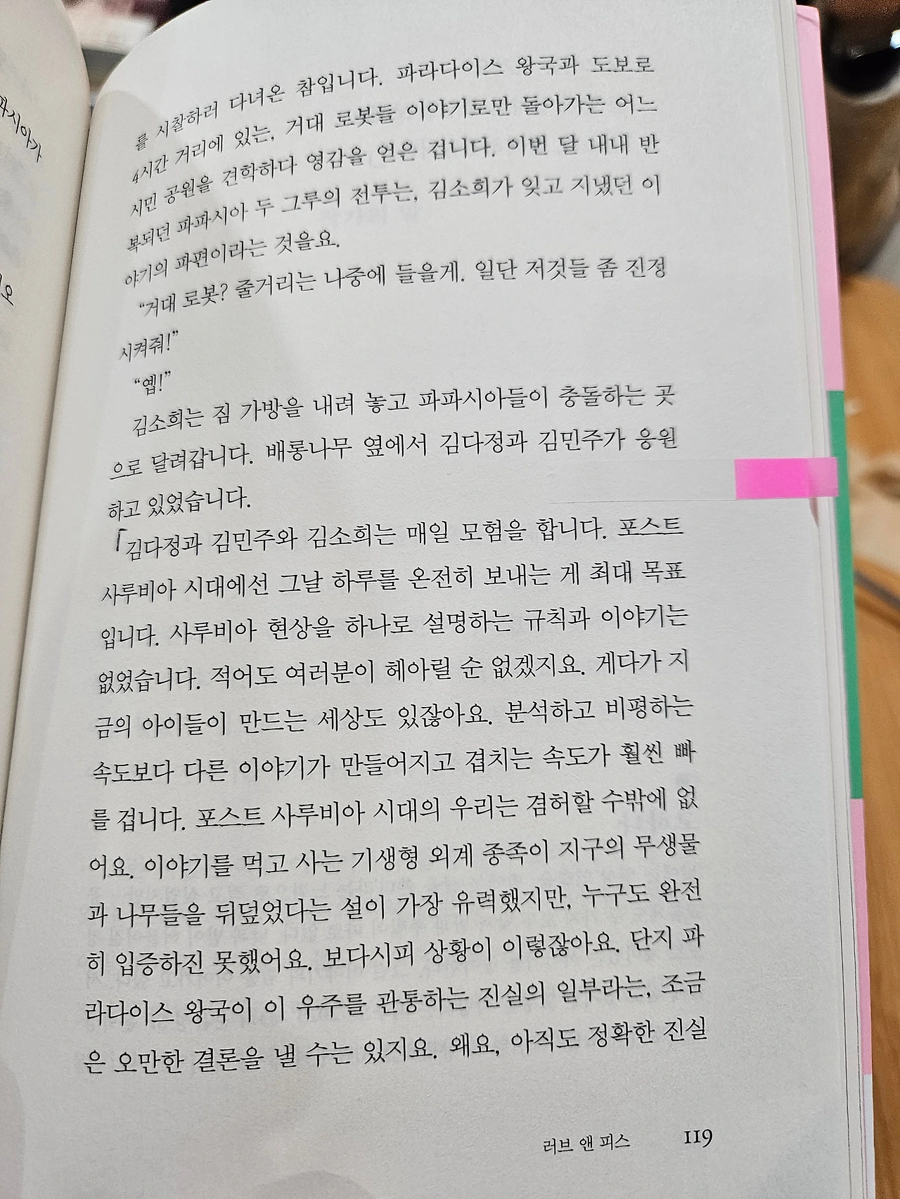 “김다정과 장호영과 현지우의 세계에서 파라다이스 왕국이 지향하는 가치는 그날그날의 놀이에 집중하는 것이었습니다. 굳이 역사의 끝을 정해놨다면 막연하게 낙원을 만들자는 건데, 어떤 낙원인지는 합의한 적 없습니다. 모두가 사랑과 평화를 획득하는 정도입니다. 하지만 그 사랑과 평화를 얻기 위해 필요한 구체적인 행위, 제도, 실행 그런 건 놀이에 없었어요. 김민주의 탐정 세계도 끝을 내다본 세계가 아니었어요. 김소희가 만든 세계의 끝은, 글쎄, 볼드모트의 죽음일까요? 이야기가 그렇게 끝나버려도 괜찮은 걸까요?” (111쪽)
