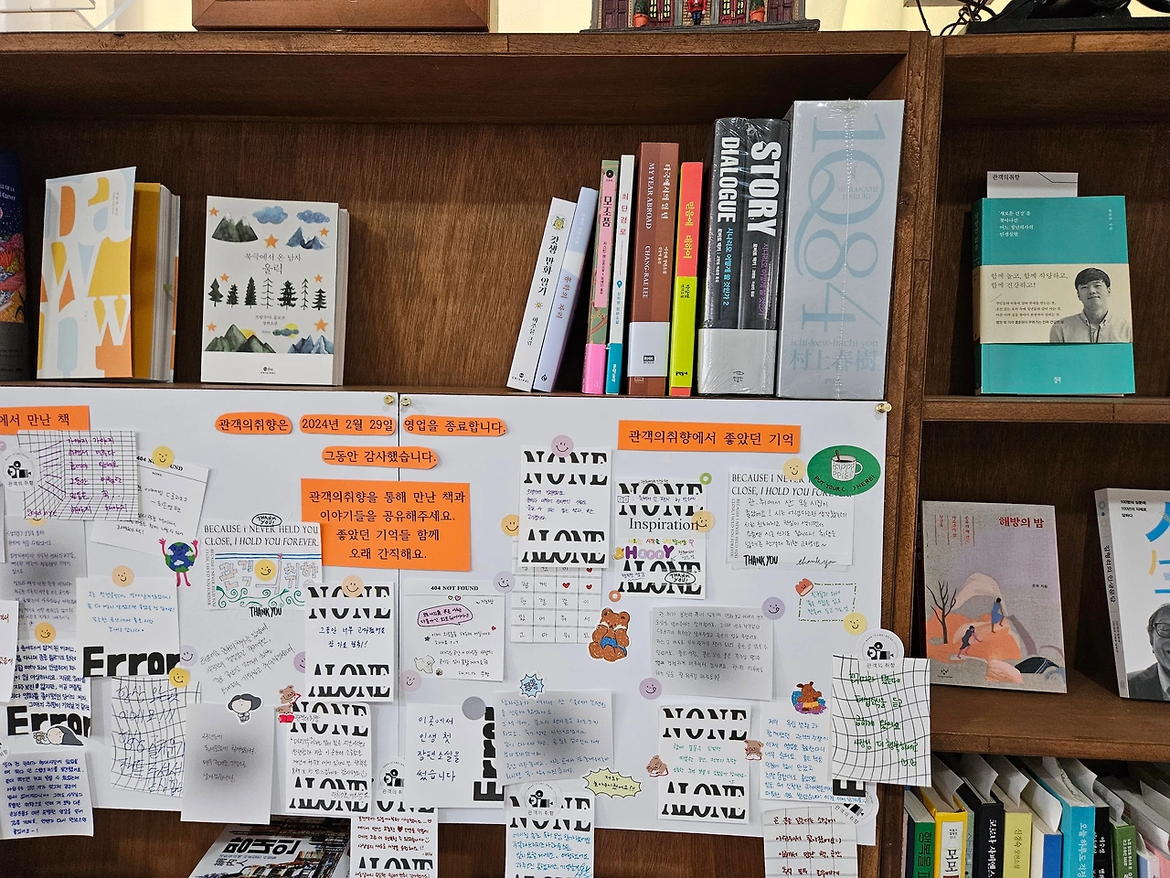 ‘영화 글’을 2013년부터 썼으니 내 글쓰기 이력의 절반은 관객의취향과 함께였다고 말해볼 수 있다. ‘단골’이라 하기 조금은 쑥스러울 만큼 자주는 방문하지 못한 시기도 있지만 좋아하는 공간 하나가 (지금은) 사라지는 건 그럼에도 달리 표현할 길 없는 아쉬운 일이다. 다행히 2024년 2월에는 커피를 마시거나 책을 사러 몇 번 걸음 할 수 있었다. 관객의취향 덕분에 살롱드북이라든지 서울대입구 주변의 다른 곳들도 찾아 걸음 하게 되었으므로 글쓰기 이력만이 아니라 일상 여러 부분에도 공간 하나가 주는 시간을 넘어 미치는 영향은 작지 않다. 어디서든 취향의 기록이 모습을 바꿔가더라고 계속되기를 생각하면서 3월의 첫 주말을 보낸다. (2024.03.03.)