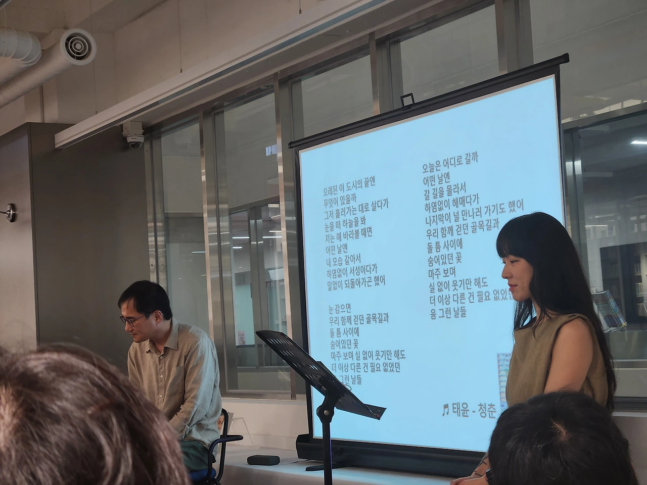 *'내가 보는 세계'는 다른 사람이 아니라 오직 나만이 고칠 수 있는데, 그건 이야기를 고유하고 다른 나만의 방식으로 채택하여 쓰겠다는 뜻이다. 그렇게 직전에 썼던 것보다 조금 더 나은 버전의 이야기가 탄생해 간다. 그러니까 그건 "사실의 세계에 저마다 다는 주석, 혹은 자막 같은 것"으로서 "자신만의 진실"(『음악소설집』에서, 프란츠, 2024, 226쪽)이다. '리얼리즘'에 대해 약간은 회의감을 가지고 있다는 그의 말에 전적으로 공감했다. 이야기 속 창조된 세계는 그 자체로 현실을 있는 그대로 대변하거나 실어 나를 수 없고, 그저 자신의 이해나 가치관이 투영된 세계를 최선을 다해 쓰는 것이다. 옆사람이 뺨을 때렸을 때 그 사람의 이유는 결코 알 수 없고 다만 '아 이래서 때렸겠구나' 하고 내 이야기를 통해 고쳐 쓴 해석이 뛰다를 뿐이라는 것.