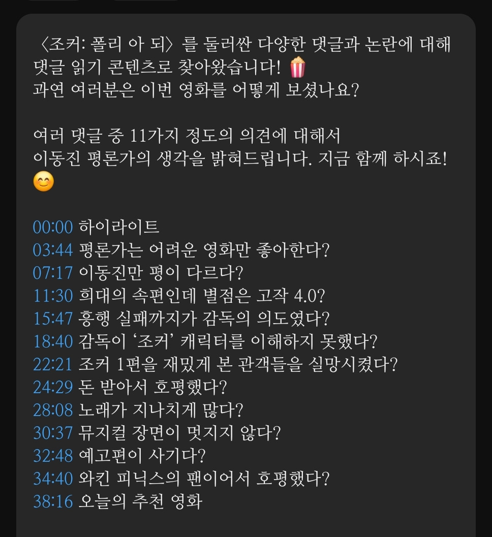 *얼마 전에 다른 영화 리뷰 크리에이터 분도 자기 영상에 대해 "돈을 받고 리뷰 영상을 만드는 것 아니냐는 의견에 대해 아무 말씀도 안 드리고 지나가면 소수의 의심 혹은 드립이 다수에게 스며드는 진실이 되어버릴 수 있겠다는 생각이 들어 제 입장을 밝힙니다."라고 부연하신 적이 있다. 정확히 같은 생각이다.