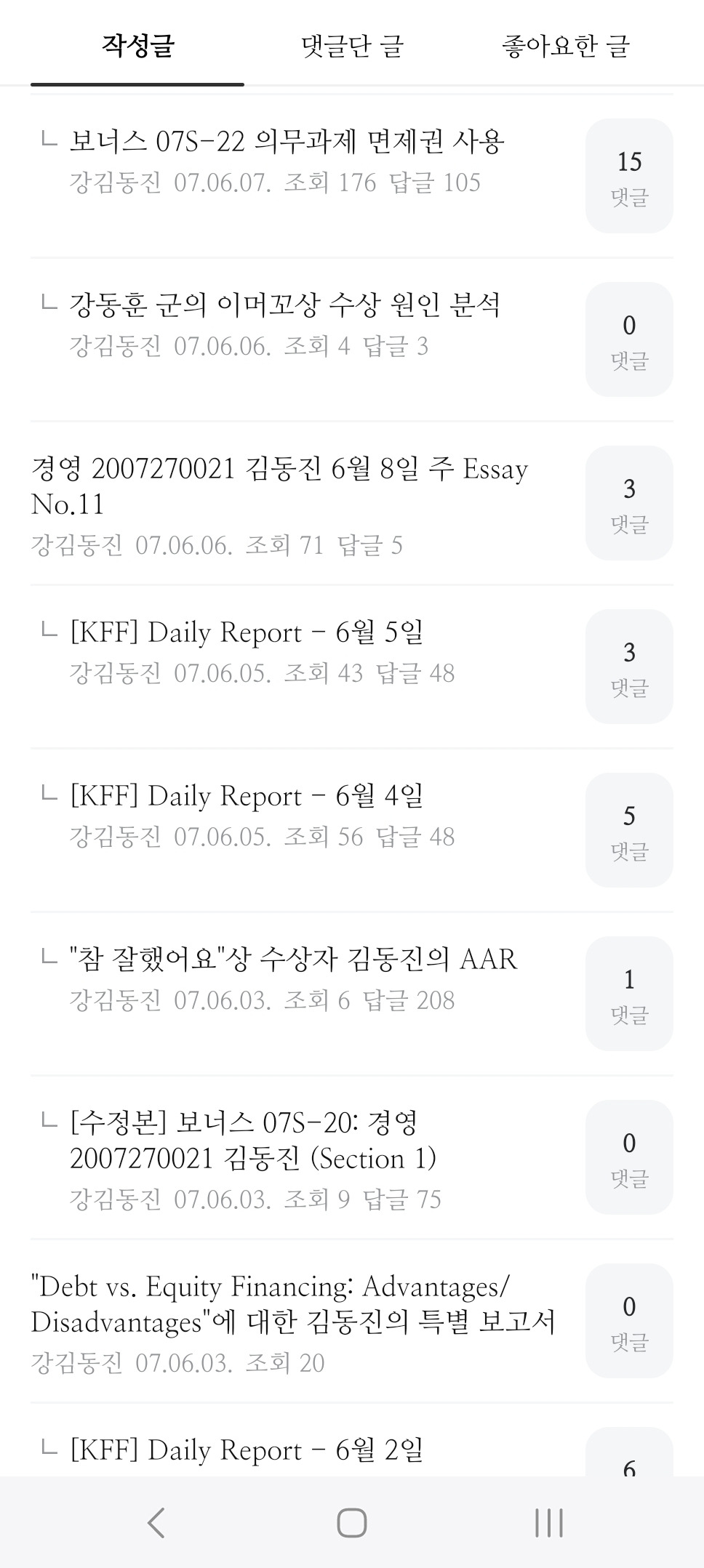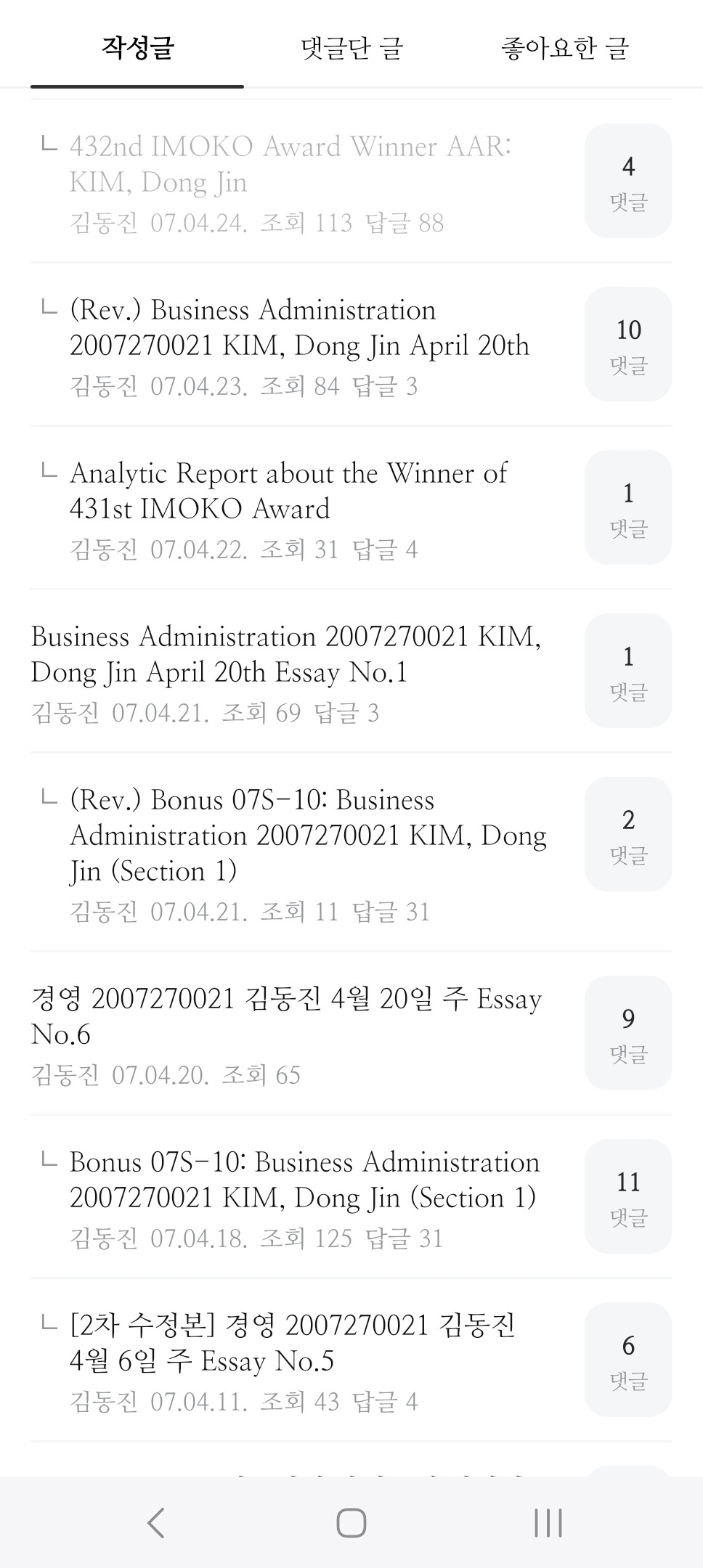 손 교수님이 언제나 강조했던 키워드는 ‘Written Communication’이었다. 여기에는 카페에 올리는 짧은 게시글과 댓글 하나도 당연히 포함이었다. 댓글을 지우는 건 누군가에게 유용할 수도 있을 정보에 대한 접근을 무단으로 침해하는 일이었고 에세이를 쓰는 건 단지 매주 해치워야 할 과제가 아니라 경제 시사에 관심을 갖고 작은 것에도 경영학적 사고를 기해 고민해 보는 연습을 하는 일이었다. 1만 자의 글을 쓰는 건 단지 분량 채우기가 아니라 그러한 사고를 충분한 분량을 할애해 치열하게 풀어놓는 과정이었다.