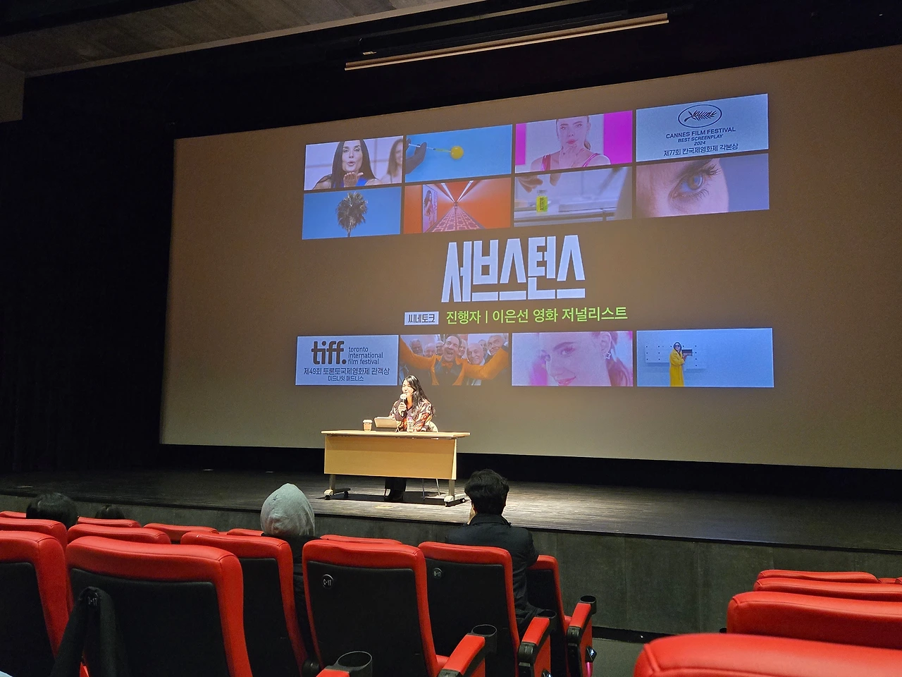 '엘리자베스' 챕터와 '수' 챕터를 지나 '몬스트로엘리자수' 챕터에 이르는 동안 예고편 등을 통해 짐작할 수 있었던 소재와 캐릭터, 그리고 쇼의 전개는 쉽사리 예상할 수 없었던 강렬하고 선명한 엔딩으로 치닫는다. <서브스턴스>는 전사나 가족관계 등 캐릭터의 세부를 거의 제거한 채, 사실상 엘리자베스/수의 집과 방송국을 제외하면 작중 세계가 작동하는 면면을 굳이 묘사하거나 설명하지 않는다. '(외적으로) 더 나은 자신'을 향한 갈망과 집착, 사회가 특히 여성에게 강요해 온 외모와 태도(하비의 "예쁜 여자는 웃어야 한다"라는 대사가 정확히 지시하듯)가 어떤 비극으로 치달을 수 있는지 '영화적'으로 보여준 141분이었다고 말해볼 수 있겠다.