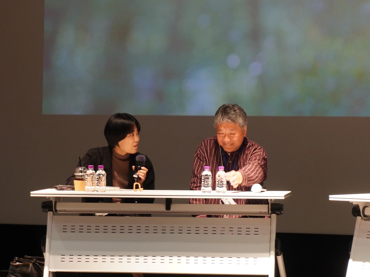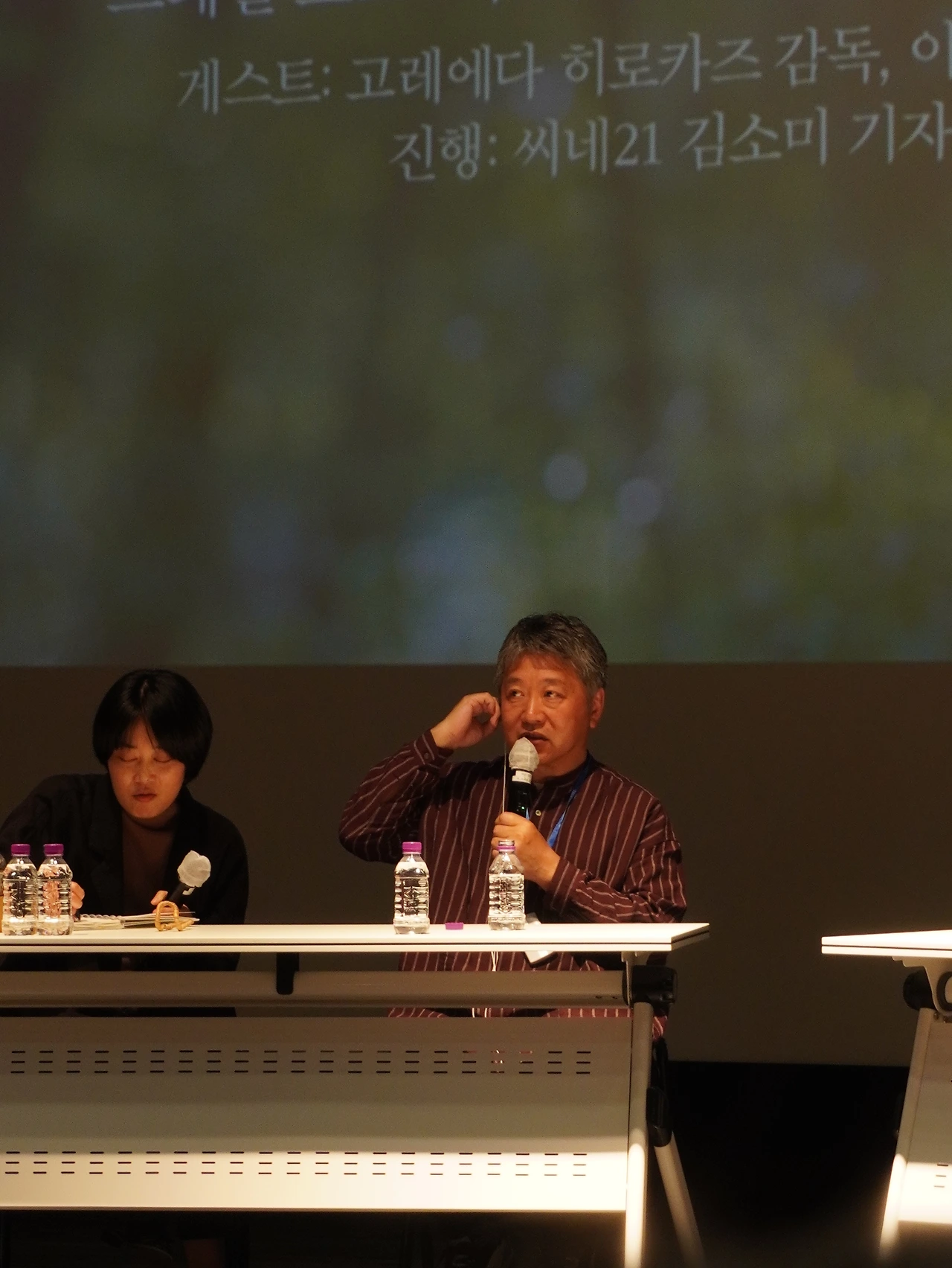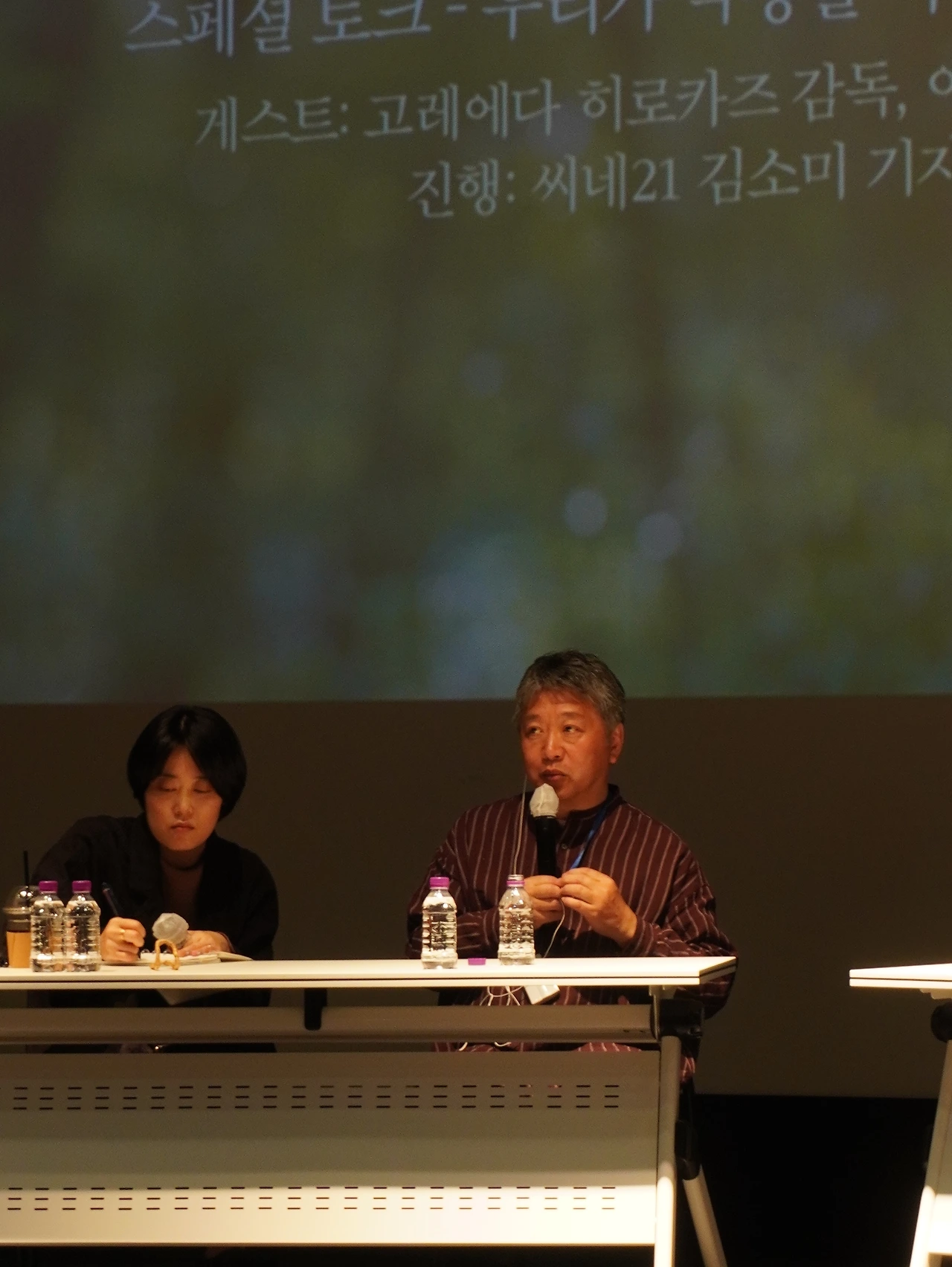이 대목에서 대화 중 고레에다 히로카즈 감독에 대한 김소미 기자의 요약적인 코멘트도 인상적이었어서 따로 기록해 두었다. "개인과 집단을 경유해서 아주 다각의 진실을 탐구해 온 창작자", "한 인생의 서사나 진실에 관해 굉장히 긴 시간을 오롯이 응시했을 때 드러나는 것들에 대하여 주목해 온", "영화관이 요청하는 집중력 속에서 발생하는 내러티브의 가능성을 주목해 온 창작자"라는 이야기.
