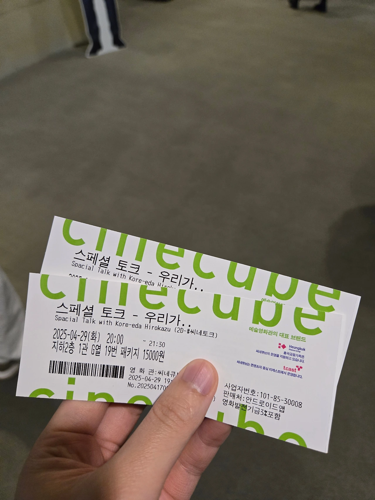 4월 29일(화) 저녁 씨네큐브 광화문 1관에서 열린 고레에다 히로카즈 감독과의 '스페셜 토크 - 우리가 극장을 사랑하는 이유' 행사의 예매에 성공해 다녀올 수 있었다. 씨네큐브에서 개관 25주년을 맞아 진행 중인 고레에다 히로카즈 감독 특별전 <고레에다와 함께한 25년>의 일환으로 마련된 약 90분간의 토크 행사였다. <씨네21> 김소미 기자의 진행으로 고레에다 히로카즈 감독과 함께 <브로커>(2022)로 연을 맺은 이동휘 배우가 참석했다.