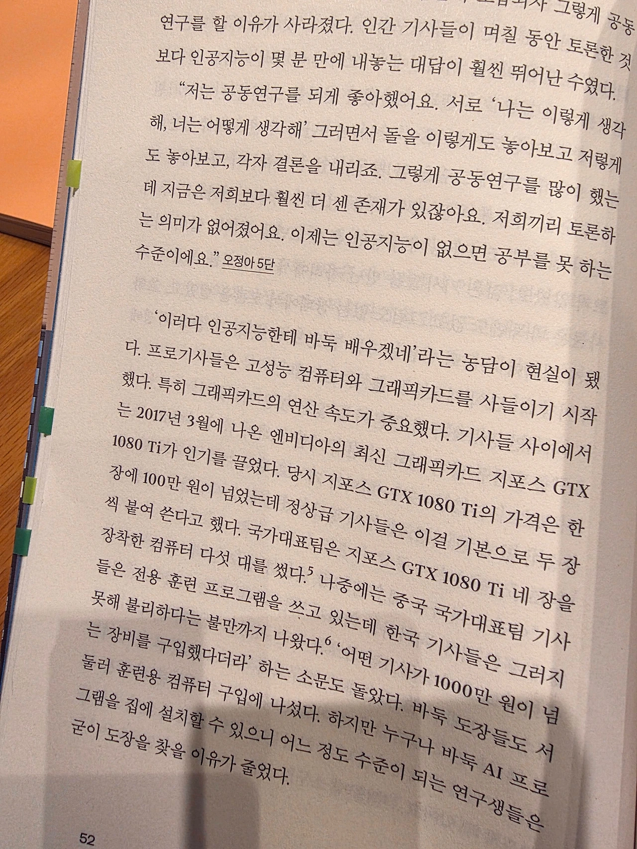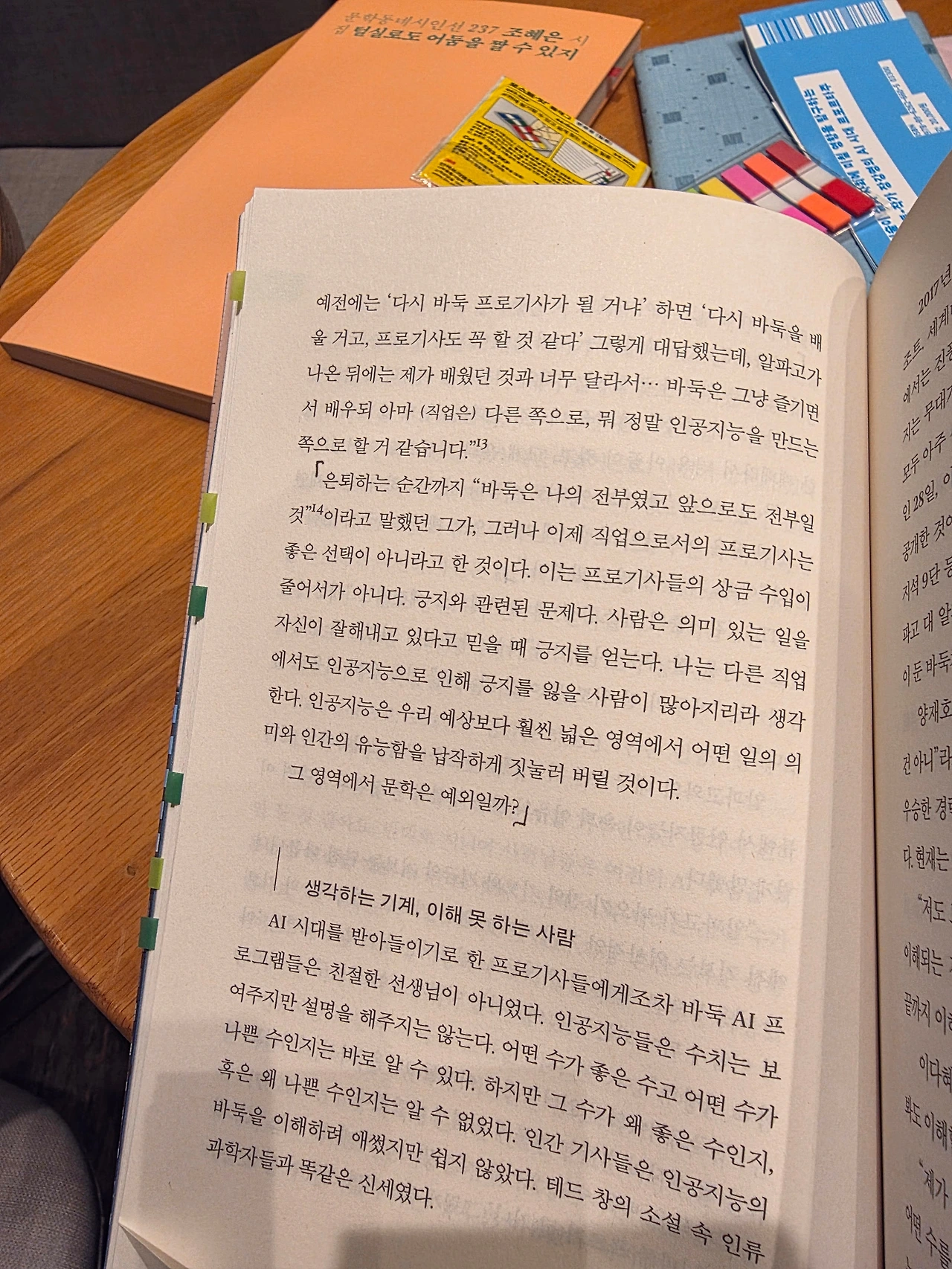인간의 바둑이라는 게 뭘까. 무엇이 인간이 두는 바둑과 그것을 두는 인간을 정의할 수 있을까. 불완전한 직관과 불명확한 단어들, 기세? 장강명의 르포만 차갑고 명철한 것은 아닐 것이다. 장강명의 소설만 행복이 무엇이고 삶의 의미가 무엇인지 묻고 있지는 않을 것이다. 그렇지만 『먼저 온 미래』를 읽으면서 장강명의 이성은 얼핏 보이는 서늘함 뒤에 늘 인간적인 것을 치열하게 지키고 싶어 하는 어떤 절박함을 내포하고 있었던 게 아닐까 싶어 계속해서 글자 너머를 생각하게 됐다. 위대한 작품이 하루에 288편이 쏟아져도 하루에 288번씩 감동할 수는 없는 게 인간이라는 것, 그 느리고 한계 가득한 인간이 여전히 좋은 상상을 하고 미래를 바꿔나갈 수 있다는 작은 희망. 과학기술의 선 밖에서 아내를 기다리며 기도하는 사람. 실체도 모른 채 먼저 와 버린 미래를 경고하면서도, 이 인간 작가는 희망을 아직은 놓지 않고 있다. 확답할 수는 없지만 같이 분석하고 고민해 보자고 이 이야기로 손을 내미는 인간 작가의 간곡함이 이 책을 읽는 일을 어쩐지 울컥하게 만들었다. (2025.09.27.)