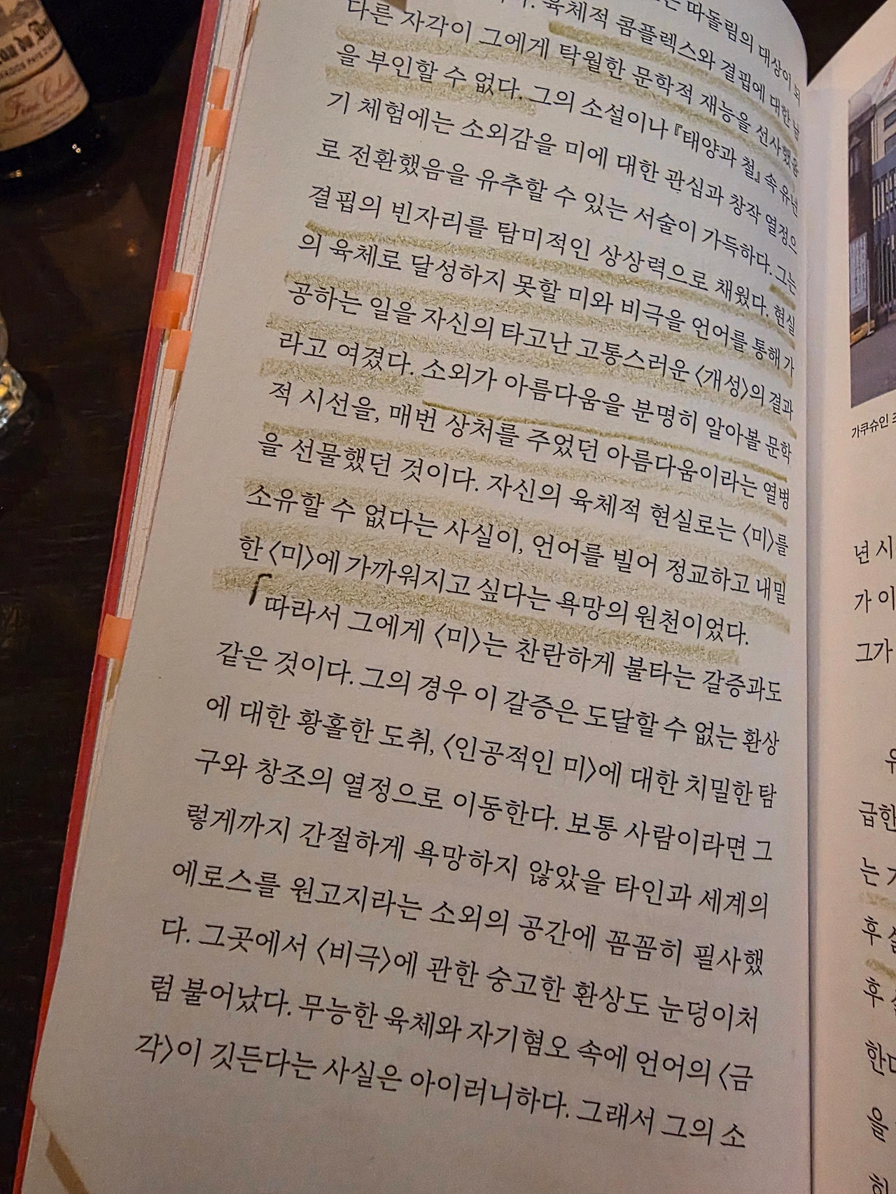 "그는 결핍의 빈자리를 탐미적인 상상력으로 채웠다. 현실의 육체로 달성하지 못할 미와 비극을 언어를 통해 가공하는 일을 자신의 타고난 고통스러운 <개성>의 결과라고 여겼다. 소외가 아름다움을 분명히 알아볼 문학적 시선을, 매번 상처를 주었던 아름다움이라는 열병을 선물했던 것이다. 자신의 육체적 현실로는 <미>를 소유할 수 없다는 사실이, 언어를 빌어 정교하고 내밀한 <미>에 가까워지고 싶다는 욕망의 원천이었다." (76쪽)