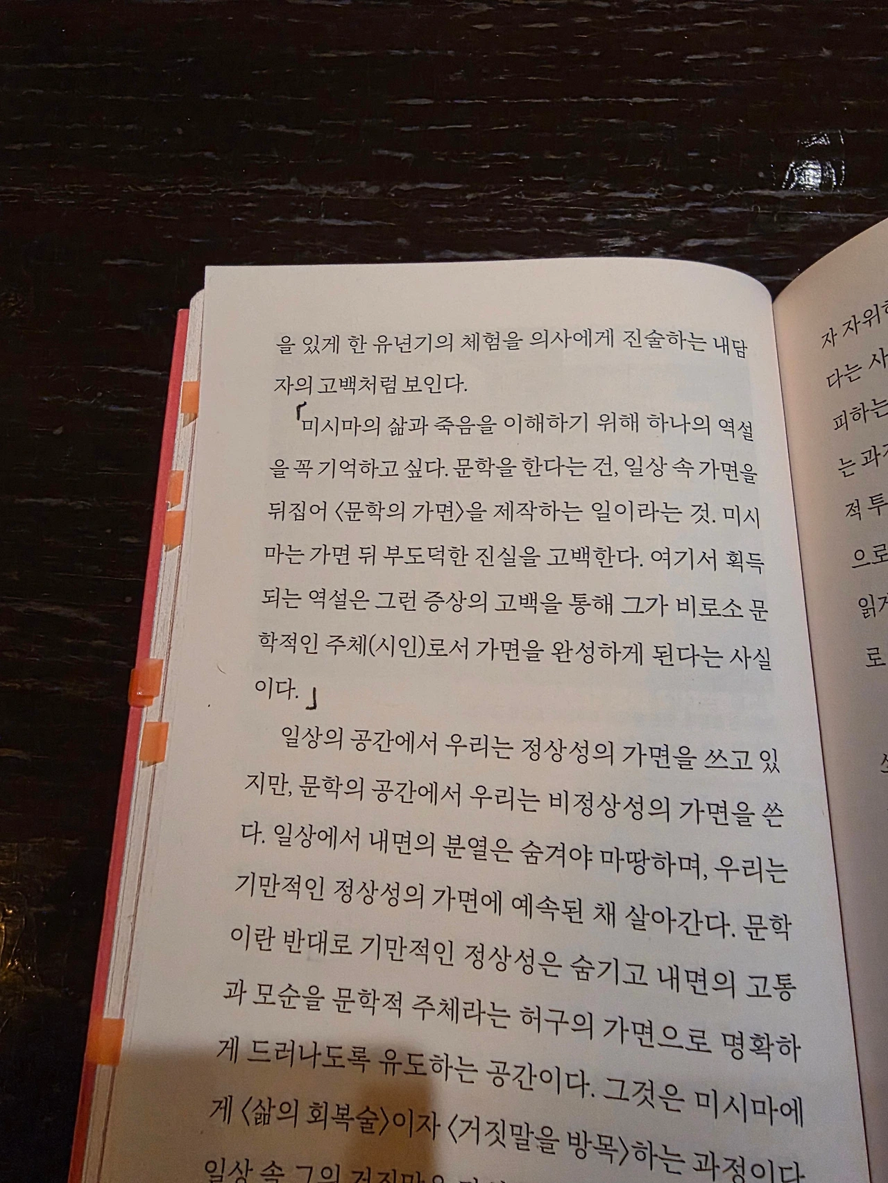 "문학은 내면의 투쟁이 솔직하고 집요하게 기록된 노트이며, 『가면의 고백』이 증명하듯 그것만으로 충분할 때도 있다. 물론 미시마가 서문에서 <고백의 본질은 불가능>이라고 언급하고 있긴 하지만 말이다. 고백이 불가능하다는 사실을 철저하게 자각한 작가가 시도하는 고백이란 대체 어떤 성격을 띠고 있을까? (...) 자신을 설명할 언어를 구하려고 지독하게 투쟁하는 인간 앞에서 느껴지는 집요하며 고독한 위안. 나도 그런 위안 속에서 글을 쓰기 시작했으며, 그것은 여전히 문학만이 선사할 수 있는 위안일 것이다." (29쪽)