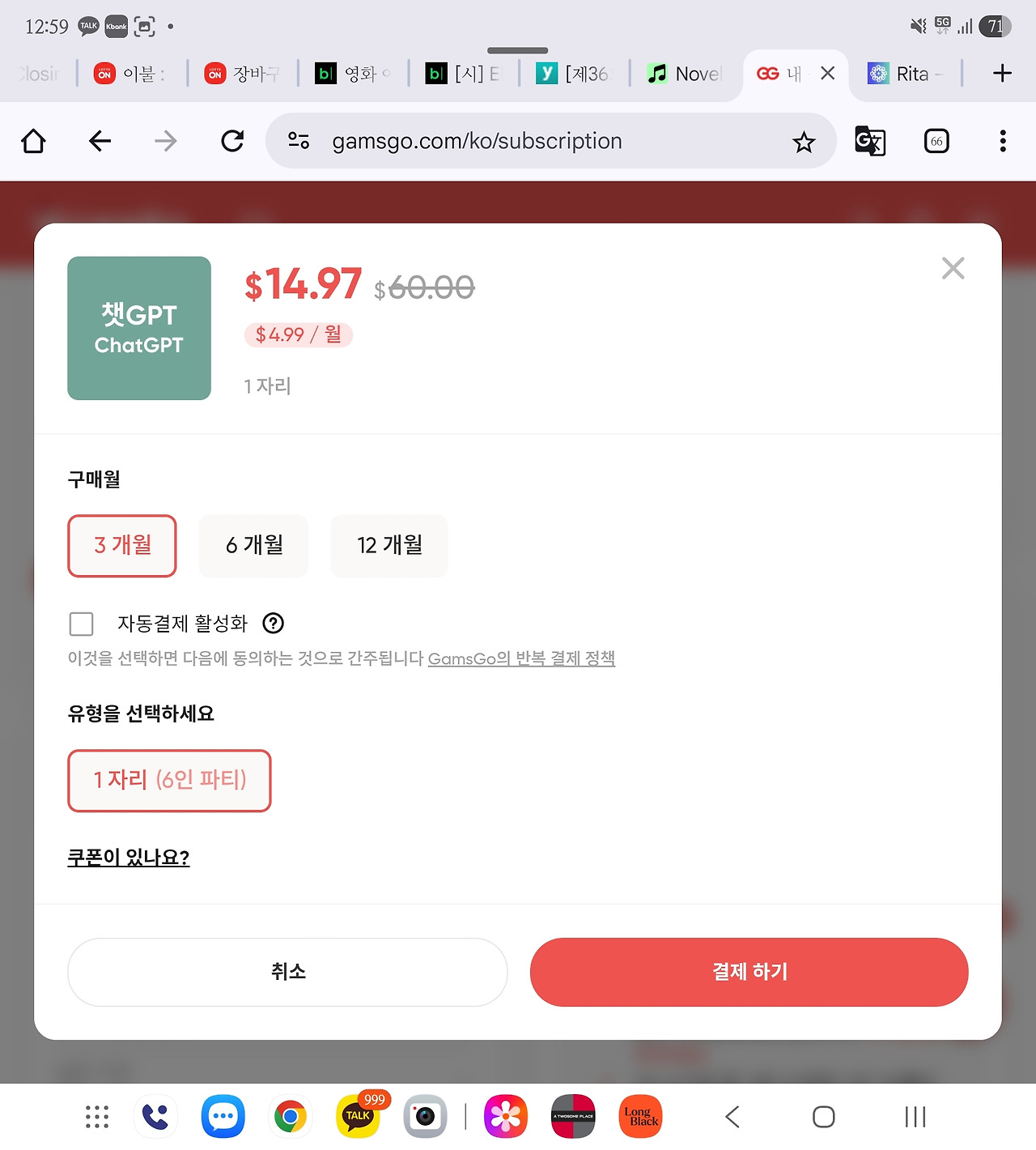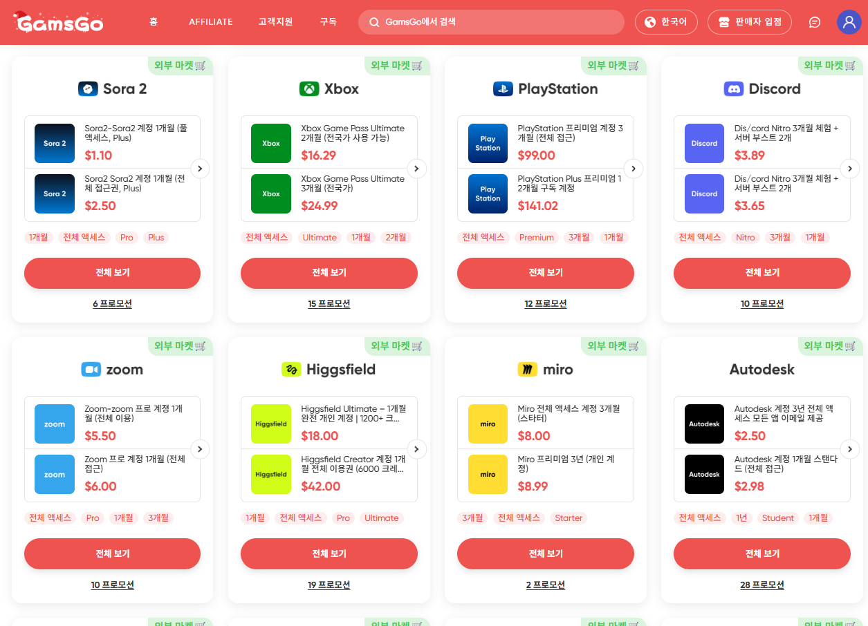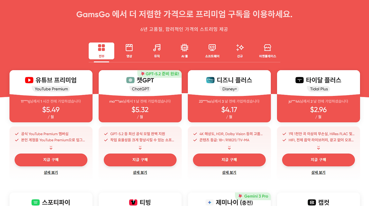 그러던 중에 영국 런던에 소재하며 글로벌 시장에서 제법 많은 이용자를 확보하고 있는 '겜스고'에서도 최근 한국시장의 서비스를 강화하고 있다. 기존 어도비, 유튜브 프리미엄, 넷플릭스, 챗GPT 등 외에도 티빙이나 웨이브, 왓챠 등도 이용할 수 있다. 운 좋게 내게 겜스고를 잠시 체험할 수 있는 기회가 주어졌다.