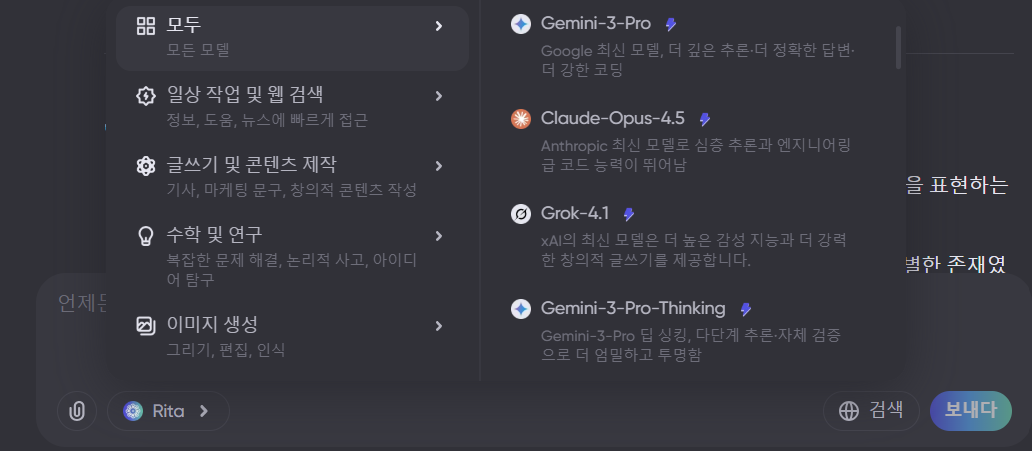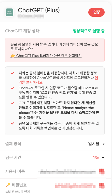 다만 챗GPT의 공유 계정을 이용 시에는 임시 대화(새로운 채팅 - 임시 채팅 시작) 기능을 활성화 해 내 대화 내용을 챗GPT 메모리가 학습하지 않도록 하고 기록 자체를 일정 기간(최대 30일) 동안만 보관 가능하도록 할 수 있다. 참고적으로, 공유 계정이 아닌 개인 계정으로 이용할 수 있는 서비스인 'Rita'도 겜스고에서 지원한다. Rita는 챗GPT 외에도 제미나이, 클로드, 미드저니 등의 주요 모델을 텍스트, 이미지, 영상, 음성에 걸쳐서 모두 이용할 수 있는 서비스다. 한편 챗GPT의 경우에는 공유 계정이 아닌, 본인 계정에 충전하는 방식으로도 이용할 수 있다는 장점이 있다. 내 경우에는 업무적으로 주로 퍼플렉시티 프로를 개인적으로 유료 구독해서 사용하지만, 퍼플렉시티의 장점을 놓치지 않으면서도 겜스고를 통해 챗GPT 플러스 기능을 체험할 수 있는 기회가 됐다.