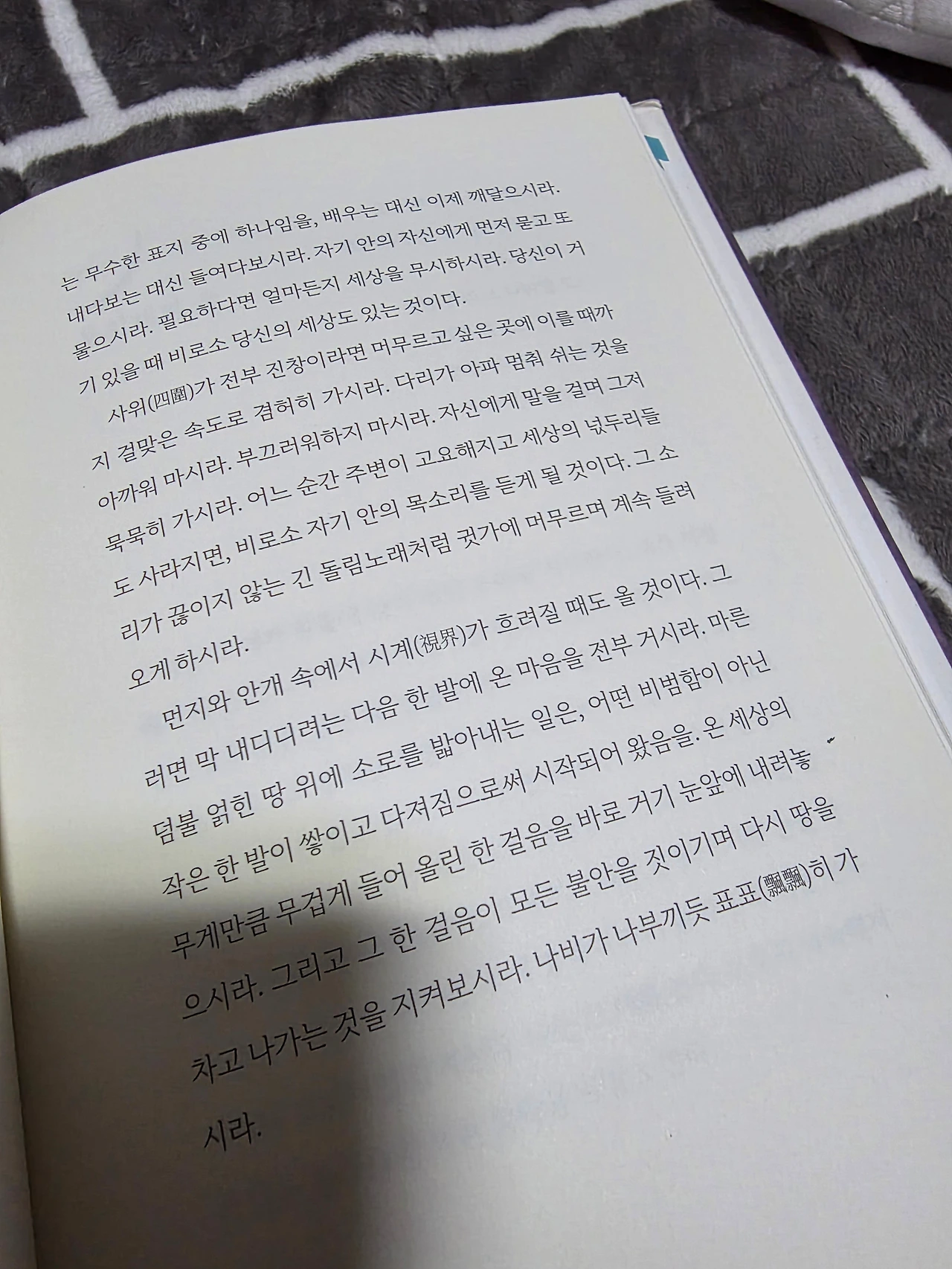 사위(四圍)가 전부 진창이라면 머무르고 싶은 곳에 이를 때까지 걸맞은 속도로 겸허히 가시라. 다리가 아파 멈춰 쉬는 것을 아까워 마시라. 부끄러워하지 마시라. 자신에게 말을 걸며 그저 묵묵히 가시라. 어느 순간 주변이 고요해지고 세상의 넋두리들도 사라지면, 비로소 자기 안의 목소리를 듣게 될 것이다. 그 소리가 끊이지 않는 긴 돌림노래처럼 귓가에 머무르며 계속 들려오게 하시라."