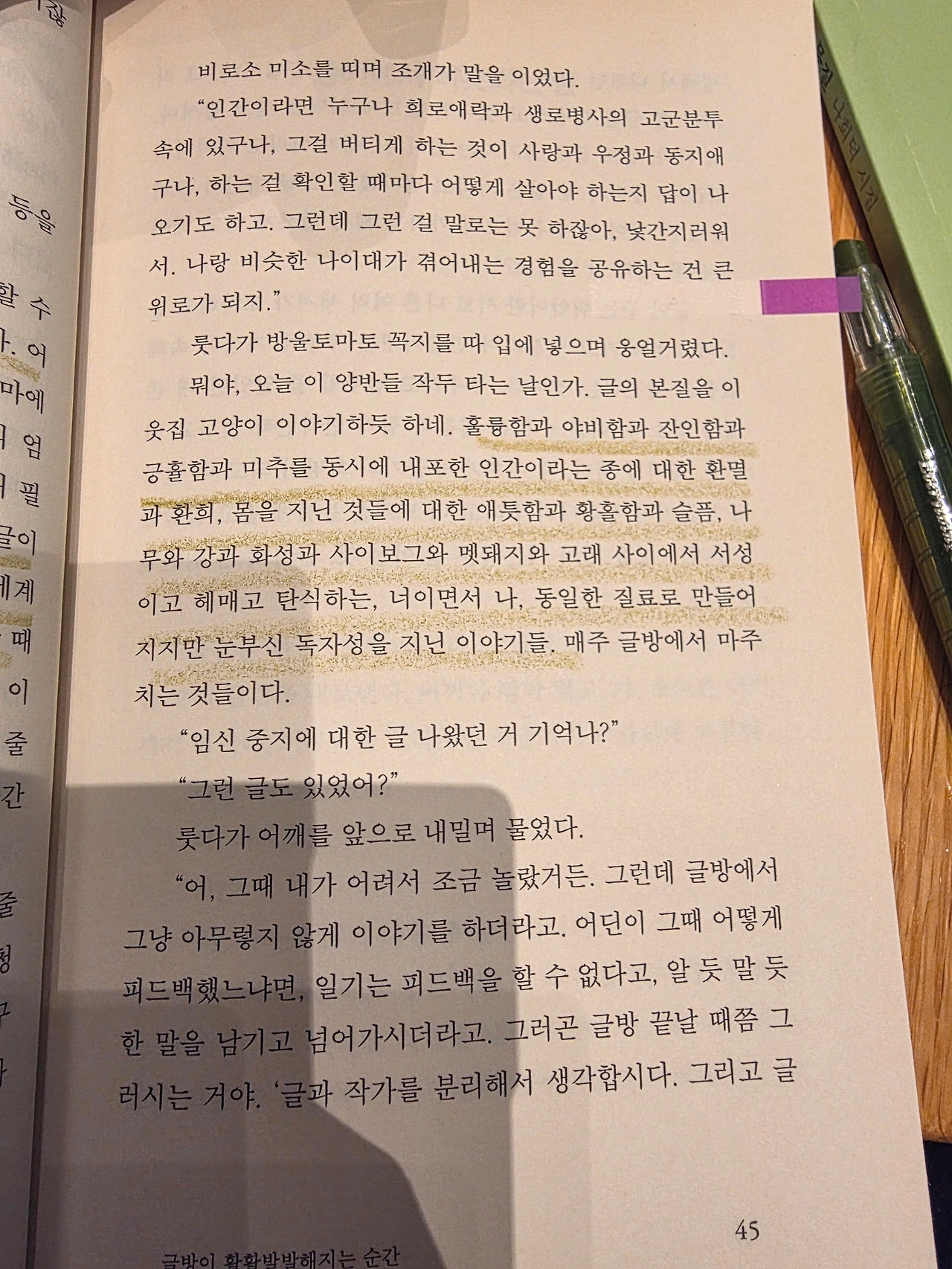 "하마는 종종 다른 사람의 피드백을 받아들일 때 걸러 듣기를 해도 좋다고 말하곤 한다. 모든 피드백을 다 받아들일 필요는 없다. 내 글을 나은 방향으로 밀고 나가는 데 필요한 이야기라고 판단되는 피드백을 취사선택해서 받아들이라는 의미란다. 중요한 이야기다. 세상 모든 사람은 자신의 경험을 바탕으로 타인의 글을 읽는다. 글이란 본시 작가의 손을 떠나는 순간 글쓴이의 의도 따위와는 무관하게 읽힌다. 온전히 작가의 것이라고도, 온전히 독자의 것이라고도 하기 어려운 것을 두고, 때로는 뜨겁게 때로는 차갑게 작가와 독자가 만나고 부딪치고 불꽃이 튀고 번쩍, 새로운 이야기가 포태된다." (240쪽)
