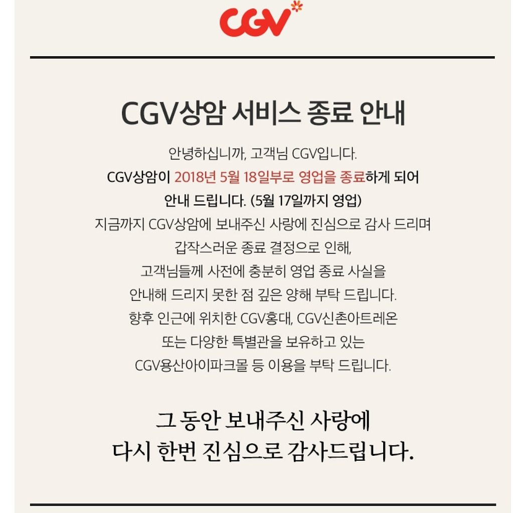 때는 2008년 봄. 기억하기로 생에서 이성과의 최초의 '데이트'라고 부를 수 있는 건 분명 그때였다. 언젠가 이루어지지 않았던 봄의 기억에 대해 잠시 적었던 적이 있는데 그 배경에 포함된 곳 중 하나가 CGV 상암이기도 했다. 벚꽃이 채 피기도 전이었다. 보자는 것을 제목만 듣고 선뜻 따라가서 본 그 영화는 그때는 지금 떠올리는 것보다 더 재미있는 작품이었다. 꽃을 닮은 마음의 말을 차마 하지도 못하고 그 계절을 보내야 했지만 잘 알지도 못하는 공간에 얽힌 기억은 그런 것이었다. 다만 몇 년 간 이 극장의 존재는 내게서 멀어져 있었다. 업무적인 일이었지만 (무려 골드클래스 관에서) 내부 시사로 애착 깊은 내 영화를 봤던 극장, IMAX 관이 있어도 딱히 방문할 일은 없었던 극장, 하루 한 번은 들어가 보는 극장 앱 속의 상영 시간표에서나 만나던 극장.
