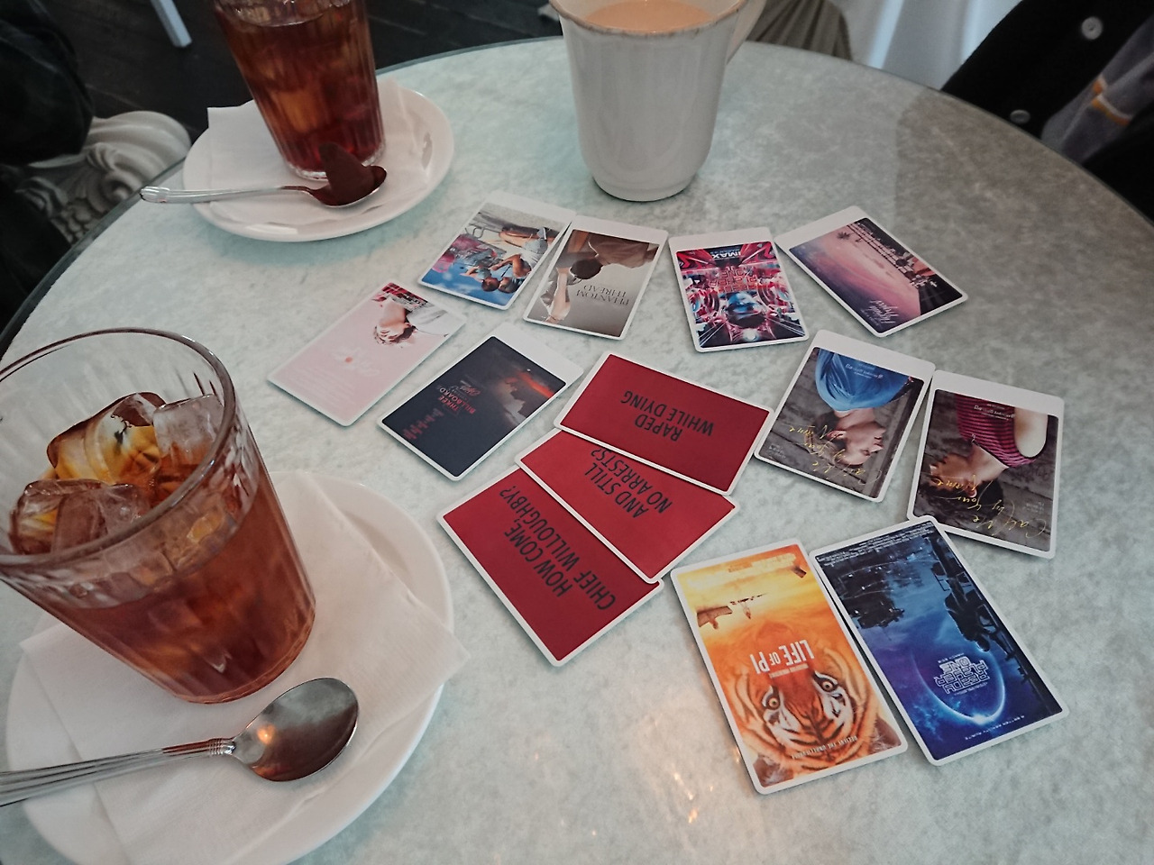 영화를 함께 감상하고 이야기 나누는 모임을 한동안 진행하면서 참석자들에게도 나름의 비슷한 경험을 하게 해주고 싶었다. 그래서 해외 이미지들을 활용해 일종의 포토티켓과 같은 카드를 만들었다. 초기에 만든 것들은 별 다른 실용성이 없었는데, 나중에는 앞면에 영화 이미지를 담으면서도 뒷면에는 각자 메모를 하거나 감상을 적어볼 수 있는 여백을 만들었고 크기도 좀 더 크게 만들었다.