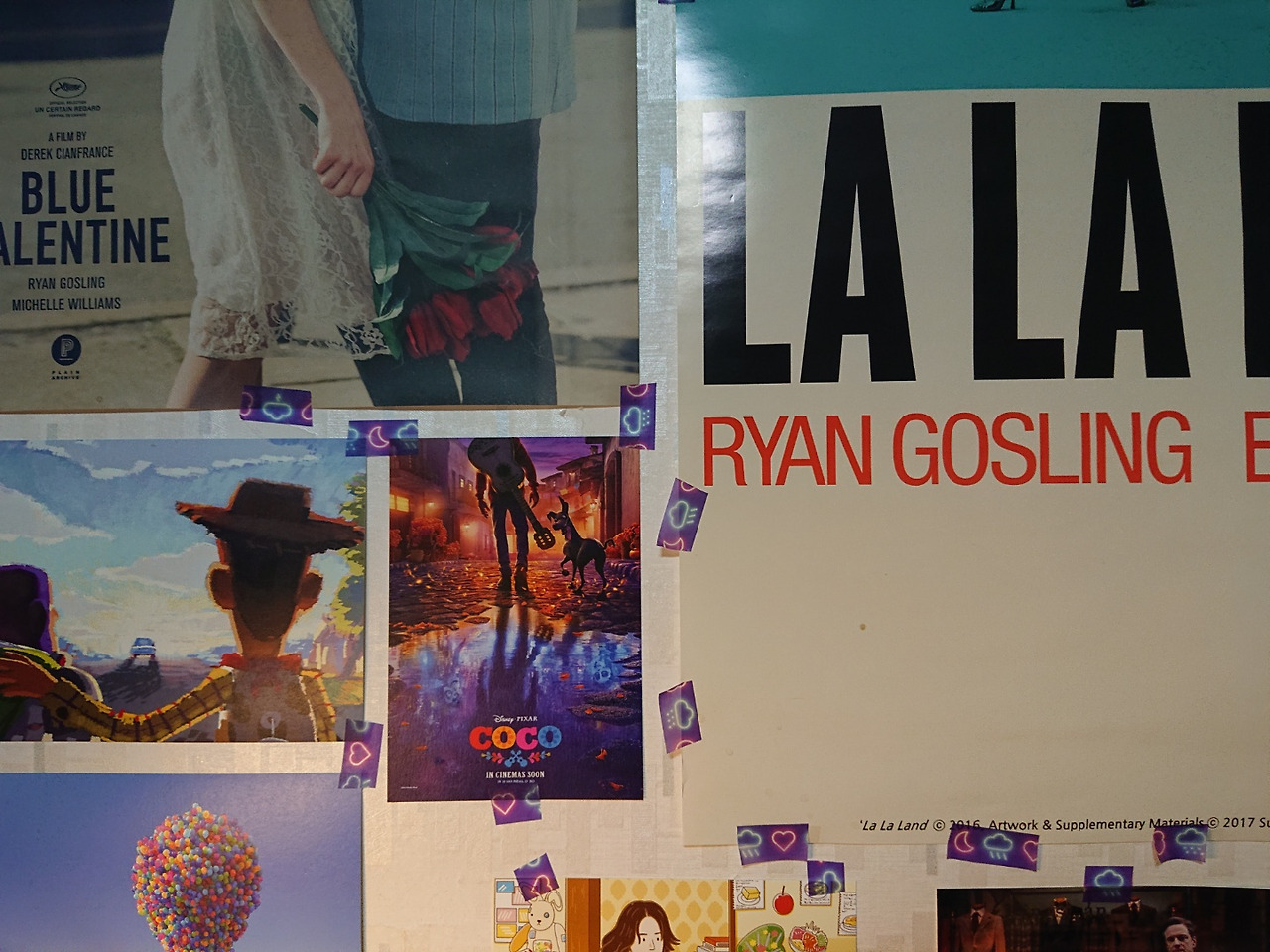 그러다 보니... 처음엔 스카치테이프를 떼서 양면처럼 만들어 뒷면과 벽 사이에 붙이기도 했고, 지금은 마스킹 테이프를 써보고 있는데 이게 벌써 몇 개월이 지나서인지 어떤 건 괜찮은데 사진의 <라라랜드>처럼 조금 큰 포스터의 경우에는 테이프가 세월(?)의 힘을 견디지 못하고 조금씩 떼어지기도 한다. 다시 스카치테이프로 돌아가야 할 것 같다. 아무튼 이 영화의 벽은, 고스란히 자신의 취향이 담긴 것이다. 좋았던 영화, 블루레이를 소장하고 있는 영화, 너무 좋았던 영화, 아주 좋았던 영화, 진짜 좋았던 영화, 극장에서 일곱 번 본 영화 등.