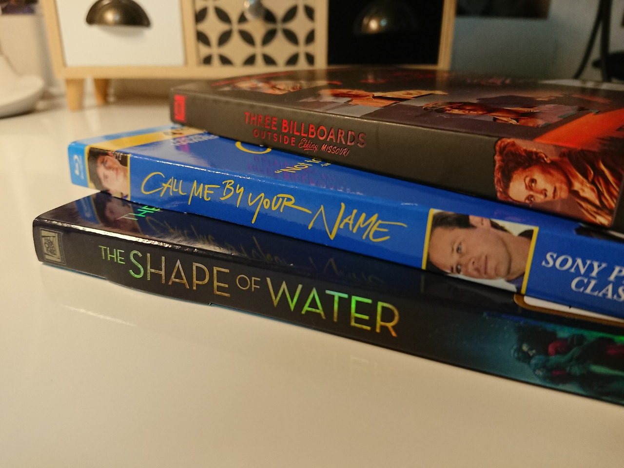 그러다 보니 이런 일도 있었다. 2018년 2월 ~ 3월 당시 극장에서 본 영화 중, 북미에서는 이미 2017년에 개봉한 영화이다 보니 해외에는 블루레이가 이미 출시되어 있는 영화도 있었다. 집에서 그 영화들을 너무 다시 보고 싶은데 아직 극장 상영 중이라, 하루에도 몇 번씩 아마존 사이트를 드나들며 블루레이를 검색했다. 그중 <쓰리 빌보드>, <콜 미 바이 유어 네임>, <셰이프 오브 워터: 사랑의 모양>의 북미판 블루레이를 결국 구입했다. (DVD는 우리나라와 미국이 지역 코드가 달리 분류되지만, 블루레이는 어쩐 일인지 우리나라와 미국의 지역 코드가 같다. 그래서 문제없이 재생할 수 있다.) 물론 국내화된 자막 같은 걸 포기하고 영상을 택한 것이지만, 운 좋게도, 아주 드물게도, <콜 미 바이 유어 네임>과 <쓰리 빌보드>의 경우 국내 극장에서 사용된 것과 동일한 번역 자막(황석희 번역가)이 삽입되어 있었다. 두 영화는 국내 개봉과 비슷한 시기에 북미에서 블루레이가 출시되었고 각각 소니와 폭스의 직배 영화이기 때문에 가능했던 일이다. (아쉽게도 <셰이프 오브 워터>의 북미판 블루레이는 영어와 스페인어만 지원한다. 현재는 위 사진의 세 영화 모두 국내판 블루레이가 정식 출시되어 있다.)