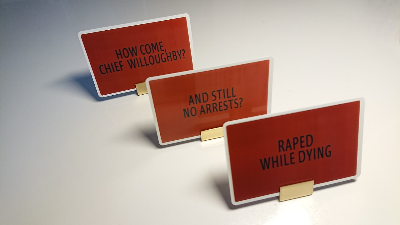 앞에서부터 각각 '죽어가면서 강간당했다', '그런데 아직도 못 잡았다고?', '어떻게 된 건가, 윌러비 서장?'이라는 내용으로, 영화 <쓰리 빌보드>에서 단지 소재를 넘어 극 중 아주 중요한 역할을 하는 핵심적인 모티브다.