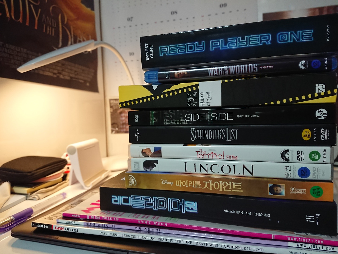 영화 덕질의 방법은 이렇게 다양하다. 위 사진은 스티븐 스필버그 감독의 <레디 플레이어 원>을 볼 당시 스필버그와 관련된 책이나 영화의 원작, 스필버그 감독의 다른 영화들 중 내가 갖고 있는 DVD, 스필버그 감독에 대한 글이 실린 영화잡지 등을 모두 꺼내며 본격 '레디 플레이어 원 덕질'을 시작했었다. 이건 절대로 내가 똑똑해서 할 수 있는 '통섭' 같은 게 아니다. 물론 똑똑해지고 싶다는 바람은 있다.