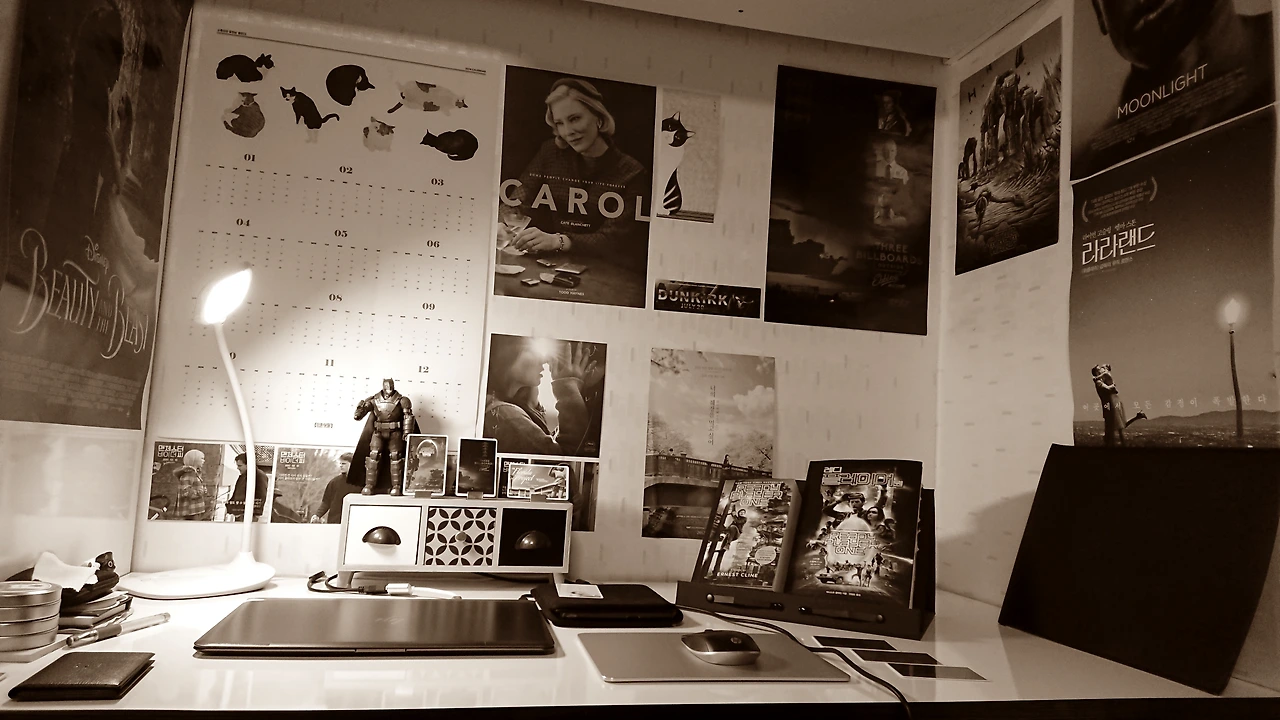 앞선 사진과 포스터의 배치가 다소 다른 걸 볼 수 있다. 지금 거주하는 곳으로 이사 온 후, 이 책상은 마치 삼면이 벽으로 둘러싸인 것처럼 답답했다. 엽서든 포스터든 뭐라도 붙여야겠단 생각이 들어 나만의 '영화의 벽'을 만들기 시작했다. 그러다 여름맞이, 겨울맞이 등 일정한 주기를 두고 몇 개월마다 포스터 배치를 바꿔보기도 하고, 기존의 것을 떼고 다른 걸 붙이기도 한다.