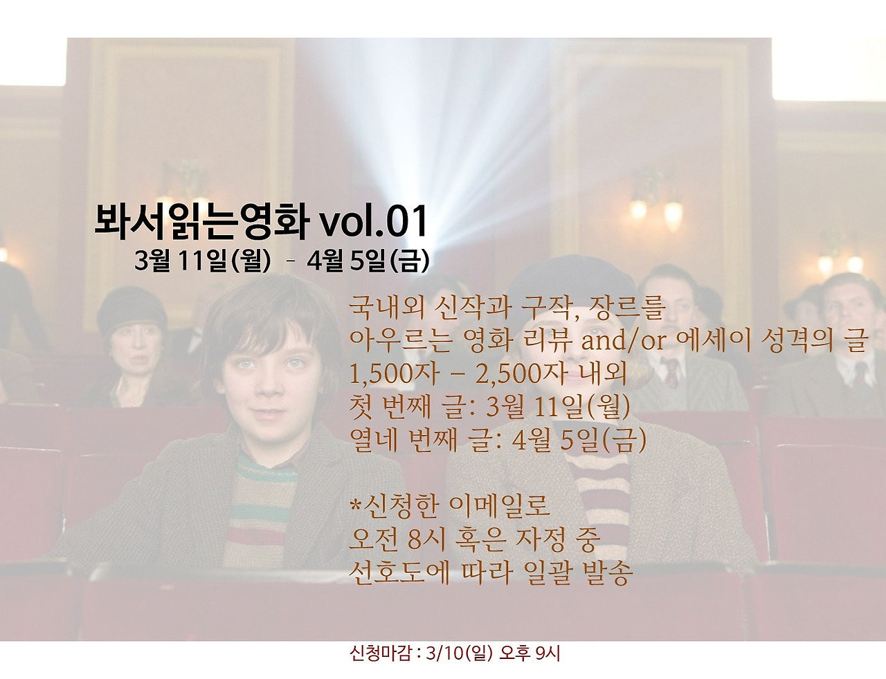 단 한 명이어도 이것을 시작하겠다고 했지만, 과연 누가 제 글을 '구독'하려 하실지에 대해 걱정하지 않는다면 거짓입니다. 그러니 많이 읽어주신다면 감사할 겁니다. 이메일로 보내는 글이므로 구독자가 없다면 시작할 수 없겠지요. '봐서 읽는 영화'라고 이름 지었습니다. 격일마다 신청하신 메일 주소로 글이 보내질 것입니다. 제 메일을 통해 글에 대한 감상이나 의견, 다뤄주었으면 하는 영화, 혹은 글을 이렇게밖에 쓰지 못하느냐는 불만이나 항의 등 모두 전해주시면 소중히 읽고 생각하며 제 글에 반영하겠습니다. 4주간의 구독료는 9천원으로 잡았습니다. 신청은 3월 10일(일) 저녁 9시까지, 링크를 통해 해 주세요. 고맙습니다.
