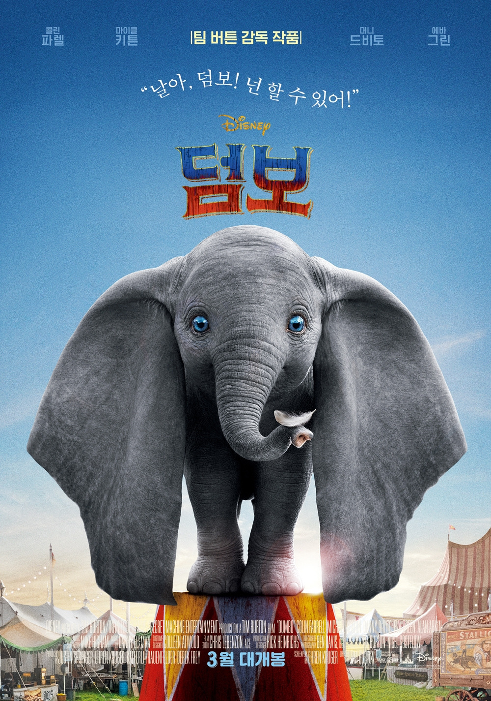 <이상한 나라의 앨리스>(2010) 이후 오랜만에 팀 버튼 감독이 다시 디즈니 영화를 맡았다. 콜린 파렐, 마이클 키튼, 대니 드비토, 에바 그린 등이 출연하는 <덤보>는 194년작 애니메이션을 기반으로 한다. 원작과 달리 동물들의 비중이 줄어들고, 서커스장을 배경으로 사람들의 이야기가 더해진 것으로 보인다.