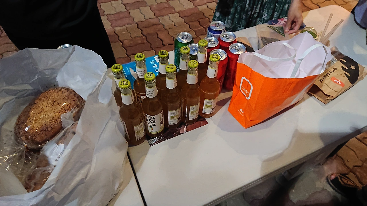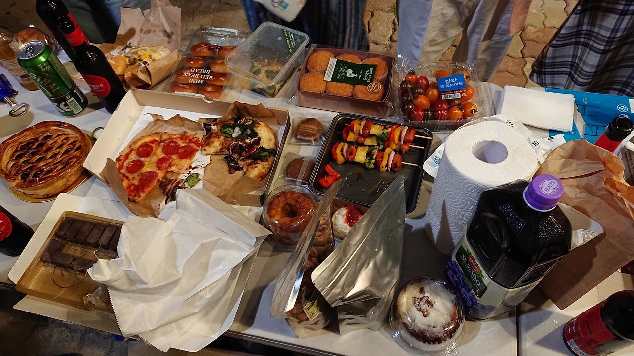 포트럭 파티, 저마다 음식과 다과류를 사오거나 준비해온 사람들