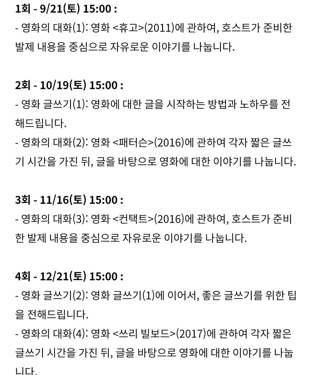 2) 9월 21일, 10월 19일, 11월 16일, 12월 21일. 네 번의 토요일 오후 3시에 만납니다. 회당 모임 시간은 2시간에서 3시간 사이입니다. 1회차와 3회차는 제가 발제를 준비하되 자유롭게 대화를 나눌 수 있게 도와드리며, 2회차와 4회차는 영화 리뷰 쓰기에 대한 간단한 강의를 하며 그 영화에 대한 감상을 각자 글로 표현하고 이야기 나눌 수 있는 시간을 드립니다. 여기서 말한 영화 리뷰 쓰기란, 글쓰기 실력을 집중적으로 향상시키는 데 목적이 있는 게 아니라 직접 글을 써봄으로써 스스로의 생각과 마음을 들여다보고 자신의 취향을 발견하고 정립하는 데 더 밀접한 의미를 둡니다.