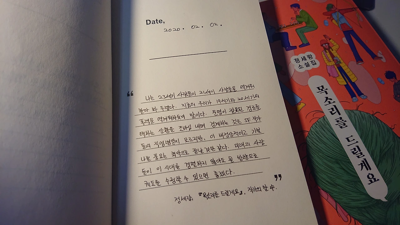 2020년 02월 02일. 좋아하는 서점에서 좋아하는 작가의 책을 샀다. 근래 읽은 '작가의 말' 중 손꼽을 만큼 기억해두고 싶은 말이라 적어두기로 했다. 정세랑의 『지구에서 한아뿐』과 김초엽의 『우리가 빛의 속도로 갈 수 없다면』을 읽었을 때의 그 경이와 설렘을 생생히 기억한다. 그리고 좀 더 멀게는 테드 창의 『당신 인생의 이야기』라든지 『숨』이라든지, 어니스트 클라인의 『레디 플레이어 원』이라든지. 또 아니면 듀나, 장강명, 배명훈, 어슐러 르 귄, 필립 K. 딕과 같은 수많은 다른 이름들. 이 세상에 없는 것이나 이 세상에 없을 것을 사랑한다는 건 한편으로 그만큼 이 세상에 그것이 필요하다는 상상을 하는 일이기도 하겠다.