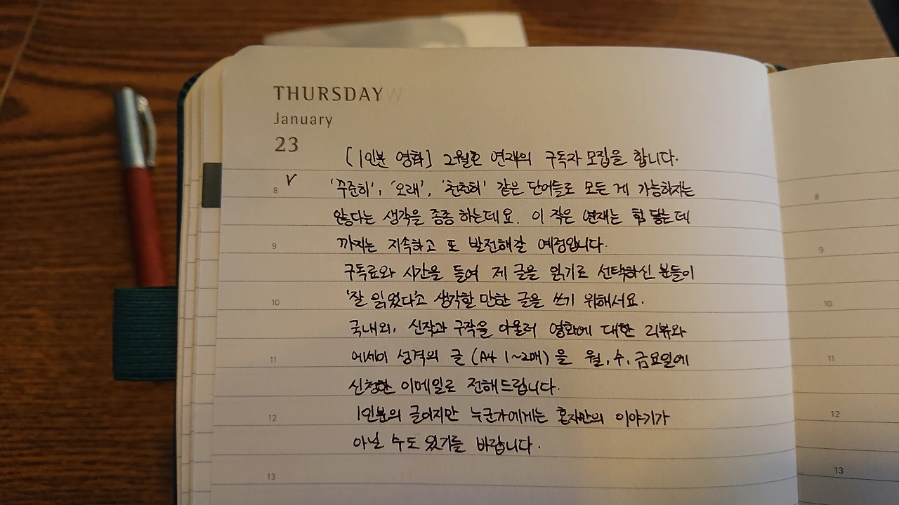 [1인분 영화] 2월호 연재의 구독자 모집을 합니다. '꾸준히', '오래', '천천히' 같은 단어들로 모든 게 가능하지는 않다는 생각을 종종 하는데요. 이 작은 연재는 힘 닿는 데까지는 지속하고 또 발전해갈 예정입니다. 구독료와 시간을 들여 제 글을 읽기로 선택하신 분들이 '잘 읽었다'고 생각할 만한 글을 쓰기 위해서요. 국내외, 신작과 구작을 아울러 영화에 대한 리뷰와 에세이 성격의 글(A4 1-2매)을 월, 수, 금요일에 신청한 이메일로 전해드립니다. 1인분의 글이지만 누군가에게는 혼자만의 이야기가 아닐 수 있기를 바랍니다.